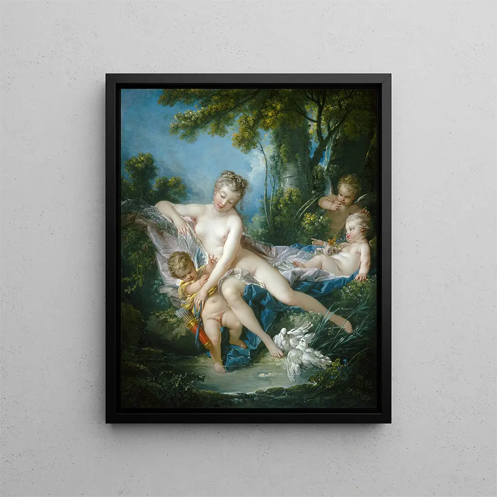 François Boucher, en av de mest inflytelserika konstnärerna i sin tid, lyckades sätta avtryck i konsthistorien med sin unika stil och sin förmåga att översätta samhällets önskningar och aspirationer under 1700-talet. Utbildad vid den kungliga konstakademin, blev han snabbt den favorittecknare vid Louis XV:s hov. Hans verk sträcker sig långt bortom en enkel skildring; det förkroppsligar en världsbild där njutning, skönhet och sensualitet hyllas. Genom "Le bain de Vénus" nöjer sig Boucher inte med att måla en mytologisk scen; han skapar en värld där varje detalj, varje färg och varje