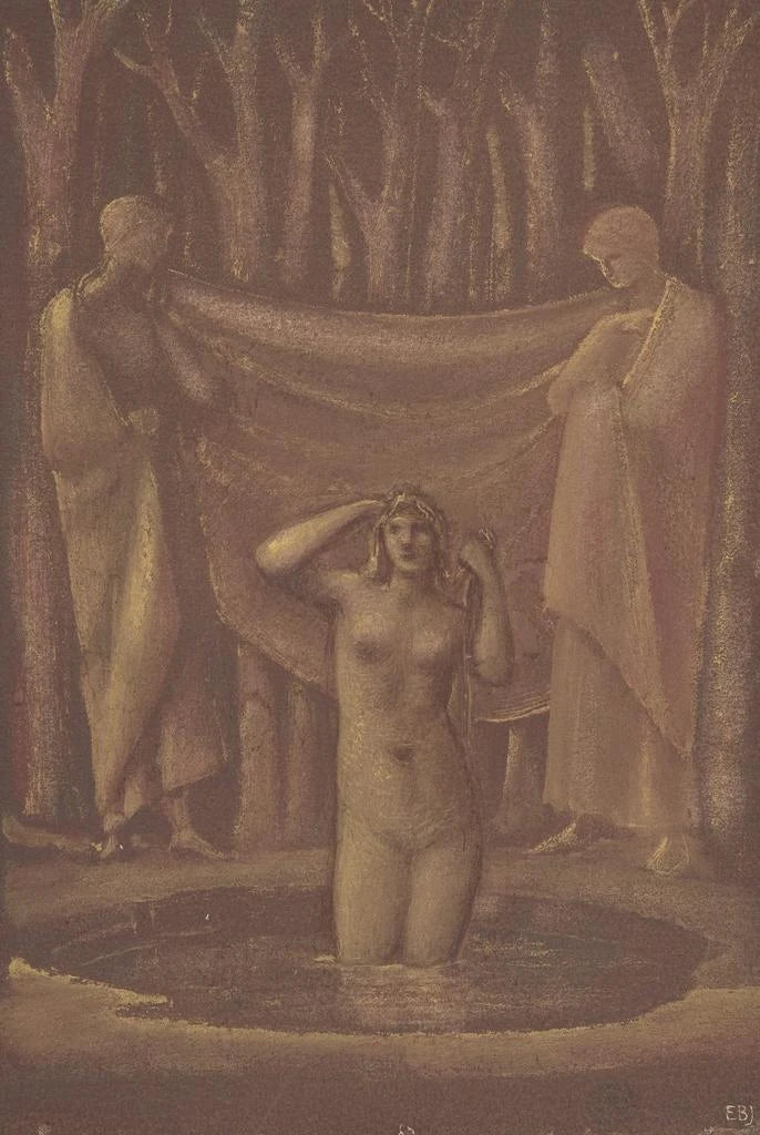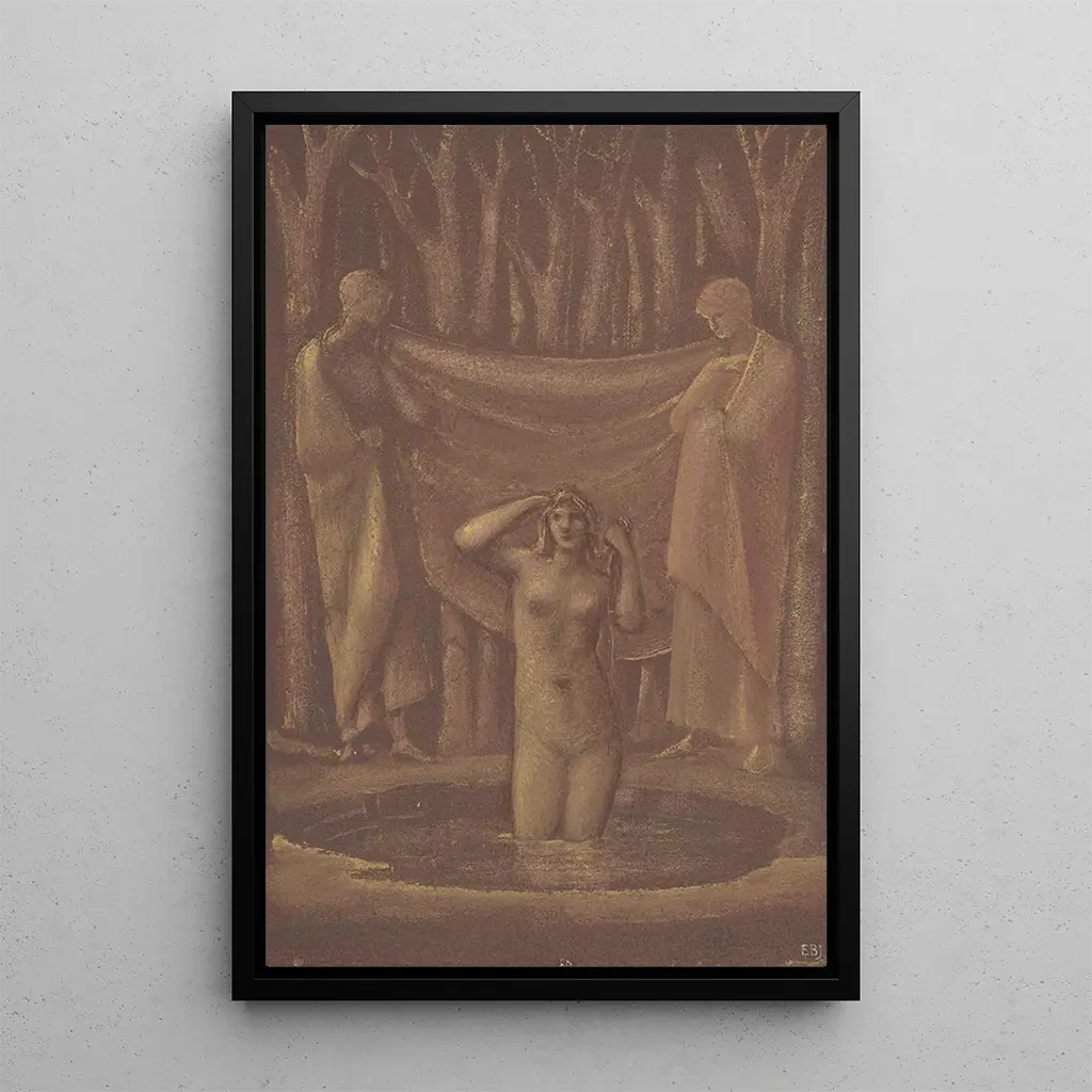Sir Edward Coley Burne-Jones, född 1833, är en av de främsta konstnärerna inom prerafaelismen, som växte fram i mitten av 1800-talet som en reaktion mot victoriansk realism. Påverkad av romantiken och dekorativ konst, lyckades Burne-Jones skapa en unik stil som blandar medeltida och mytologiska element. "Bain de Vénus" är emblematiskt för hans tillvägagångssätt, som förenar sensualitet och spiritualitet. Hans arbete har haft ett varaktigt inflytande på brittisk och europeisk konst, och han är känd för sin förmåga att omvandla klassiska berättelser till verk med stor emotionell djup.