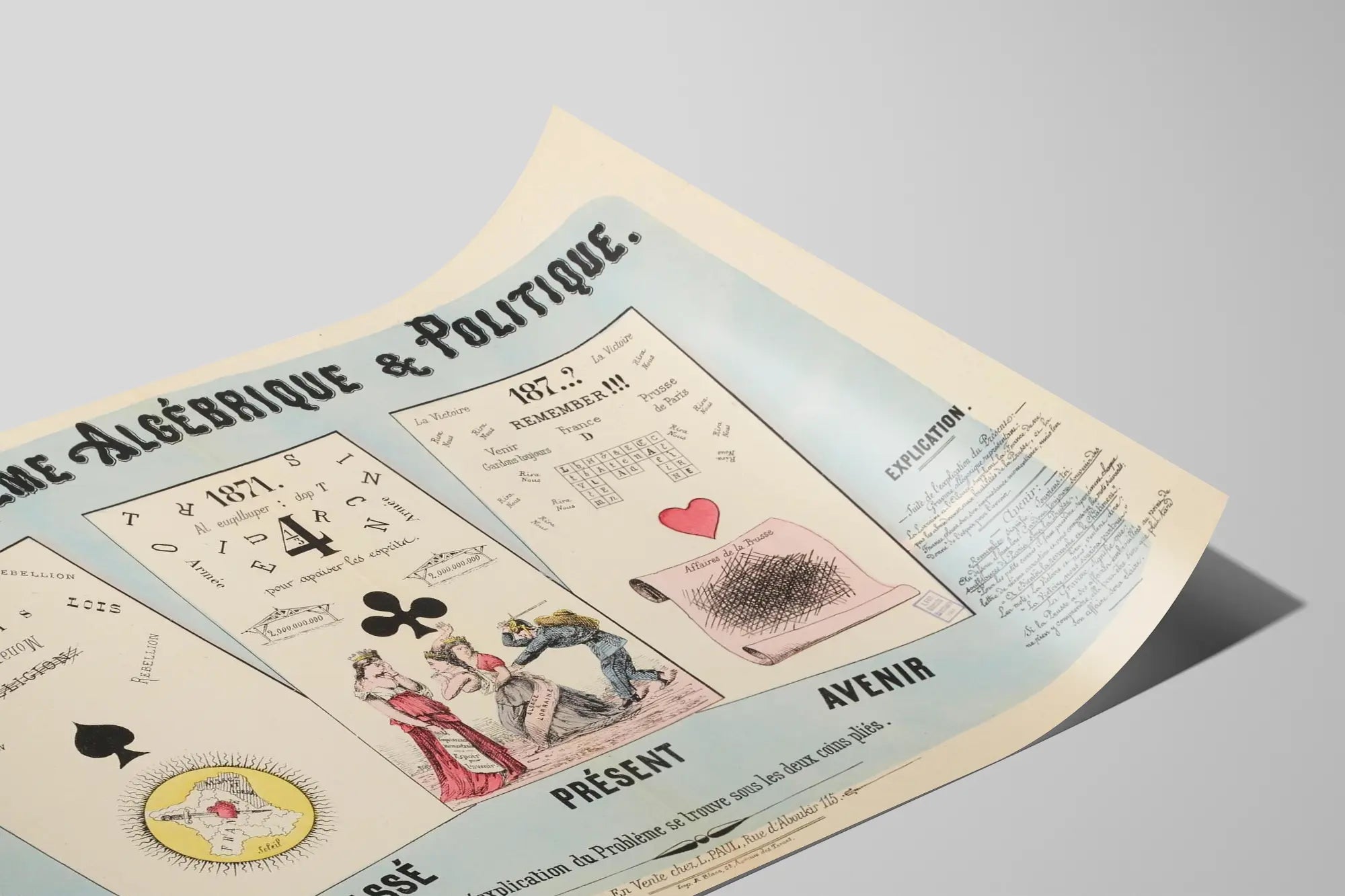 Upptäck denna vintageaffisch med titeln « Fameux Problème Algébrique & Politique », en unik väggdekoration som förenar historia och design med en touch av kritiskt tänkande. Denna väggprydnad är indelad i tre tematiska delar: det förflutna, nuet och framtiden, och illustrerar symboliskt viktiga politiska händelser kring Frankrike vid 1870-talets början. Varje sektion motsvarar ett spelkort, med symboler som spader, klöver och hjärta, vilket förstärker verkets budskap genom en originell grafisk sammansättning.