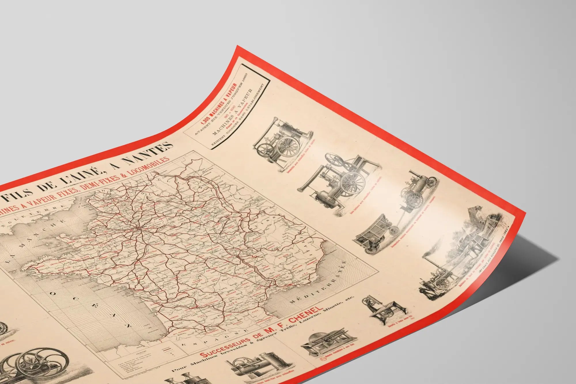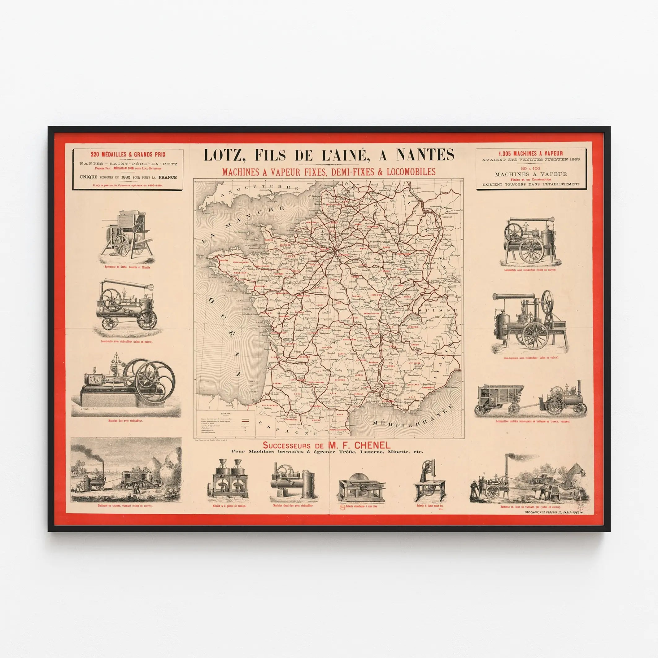 Denna vintageaffisch föreställer ett kartblad över Frankrike med detaljerade illustrationer av olika ångmaskiner, fasta, halvfasta och lokomobiler, tillverkade av huset Lotz, fils de l'aîné, beläget i Nantes. Denna poster är ett perfekt väggdekoration för entusiaster av industrihistoria och retrodesign. I mitten framhäver kartan distributionsområden och de vägar där företagets ångmaskiner har sålts, vilket ger en intressant geografisk översikt och gör detta dekorativa föremål både lärorikt och estetiskt tilltalande.