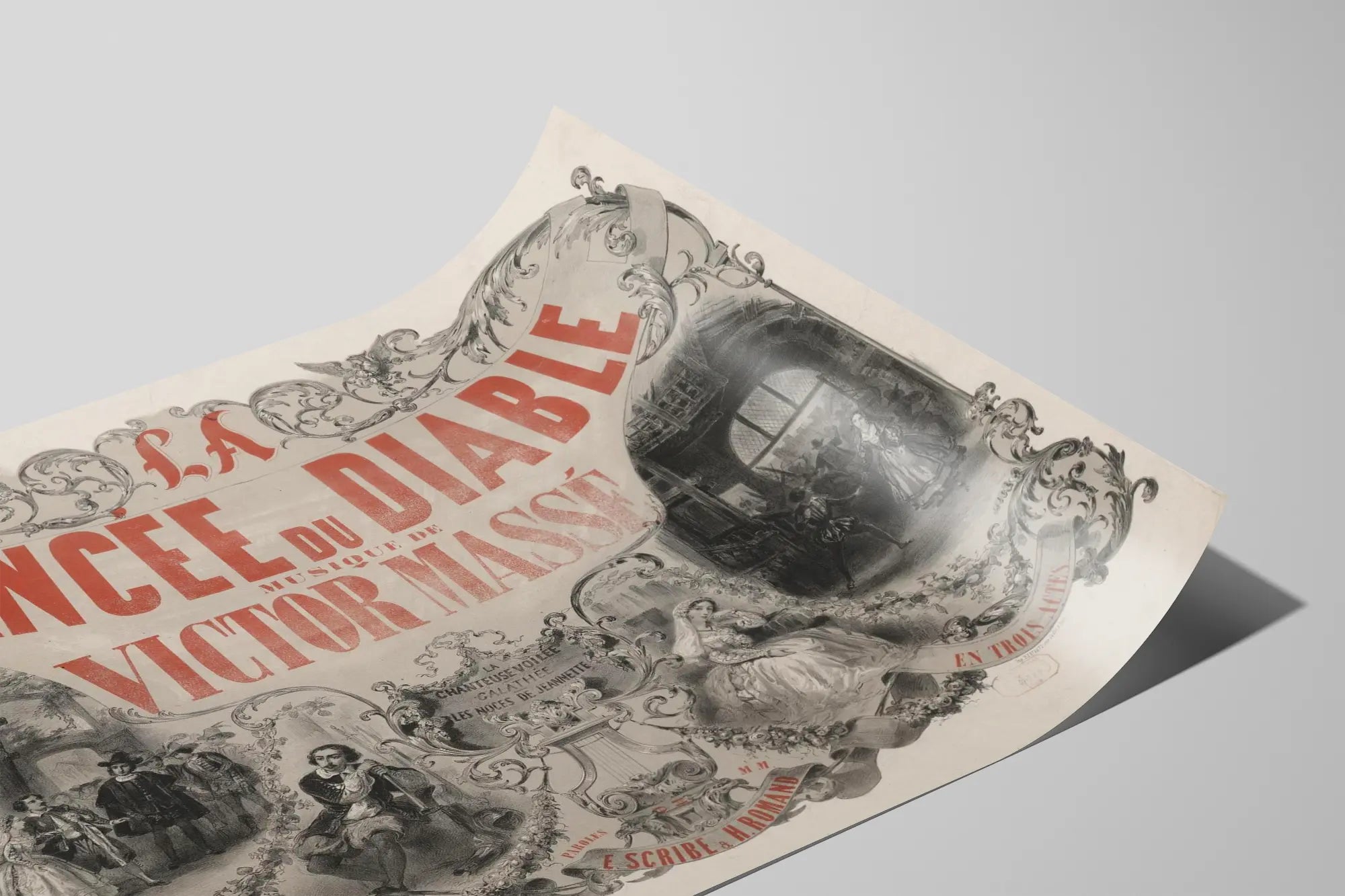 Upptäck denna vintageaffisch som föreställer "Djävulens Fästmö", ett musikaliskt verk av Victor Massé. Denna enastående väggdekoration i gammal och elegant stil är perfekt för entusiaster av komisk opera och historiska pjäser. Den konstnärliga kompositionen integrerar barocka dekorativa element med blomsterornament och en utsmyckad ram som framhäver titeln i röda versaler, vilket understryker verkets betydelse och charm.