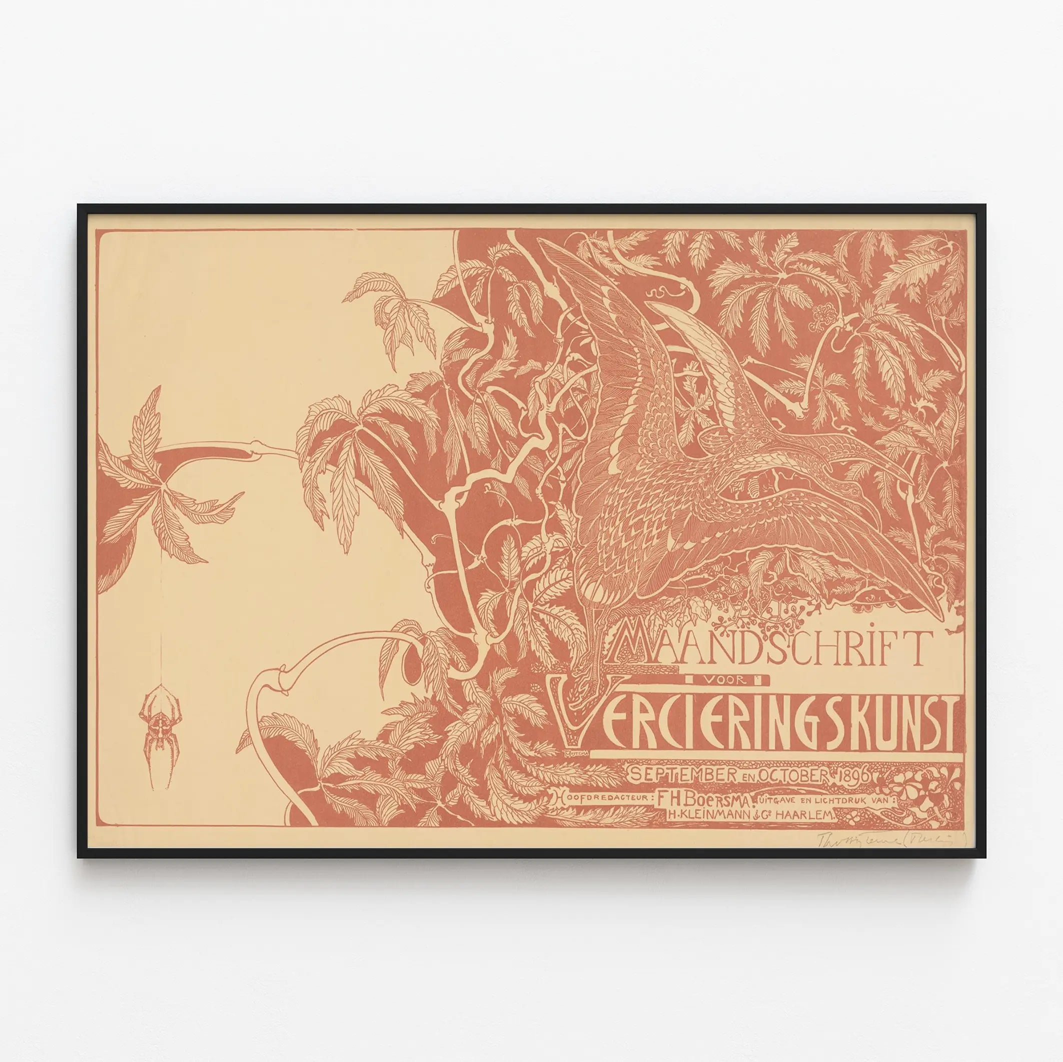 Upptäck denna affisch i jugendstil, som med fin elegans skildrar två fåglar i full flykt bland ett stiliserat lövverk. Denna väggdekoration utmärker sig genom sitt delikata grafiska uttryck och sin harmoniska komposition, där slingrande grenar och detaljerade blad omger de två fåglarna och tillför ett naturligt och elegant inslag till ditt hem. Silhuetten av en spindel som hänger i sitt nät fulländar denna naturliga scen och förstärker den raffinerade visuella effekten.