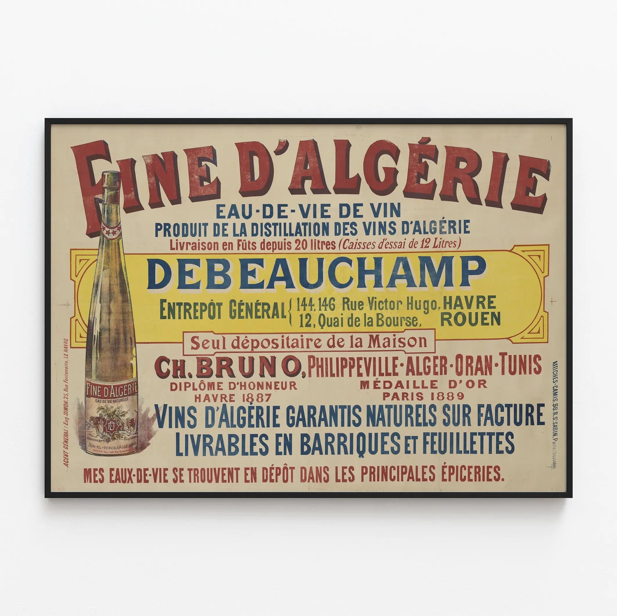Upptäck denna vintageaffisch för Fine d'Algérie, ett äkta föremål som hyllar vinbrännvin, en produkt av destillationen av algeriska viner. Denna gamla stilposter framhäver märket Debeauchamp, med starka och färgstarka typografiska detaljer som är utformade för att fånga uppmärksamheten. Denna väggdekoration är perfekt för konstälskare och vinets historia, och tillför en retro och elegant touch till varje inredning. Alla originaltexter, såsom lagringsadresser och hedersutmärkelser, är bevarade, vilket understryker äktheten och den historiska värdet av detta väggkonstverk. Denna bild passar utmärkt för att lyfta fram i ett vardagsrum, kök eller bar, och förstärker atmosfären med sin tidstypiska charm. Postern framhäver också dekorativa element som den illustrerade flaskan med etiketten "Fine d'Algérie Eau de Vie Naturelle". Med sina nyanser av rött, blått och gult smälter denna vintageväggbild lätt in i olika inredningsstilar, från klassiskt till industriellt. Skapa en originell och förfinad atmosfär i ditt utrymme med denna samlaraffisch för Fine d'Algérie, perfekt för att berika varje väggdekoration samling relaterad till vin och spritdrycker.