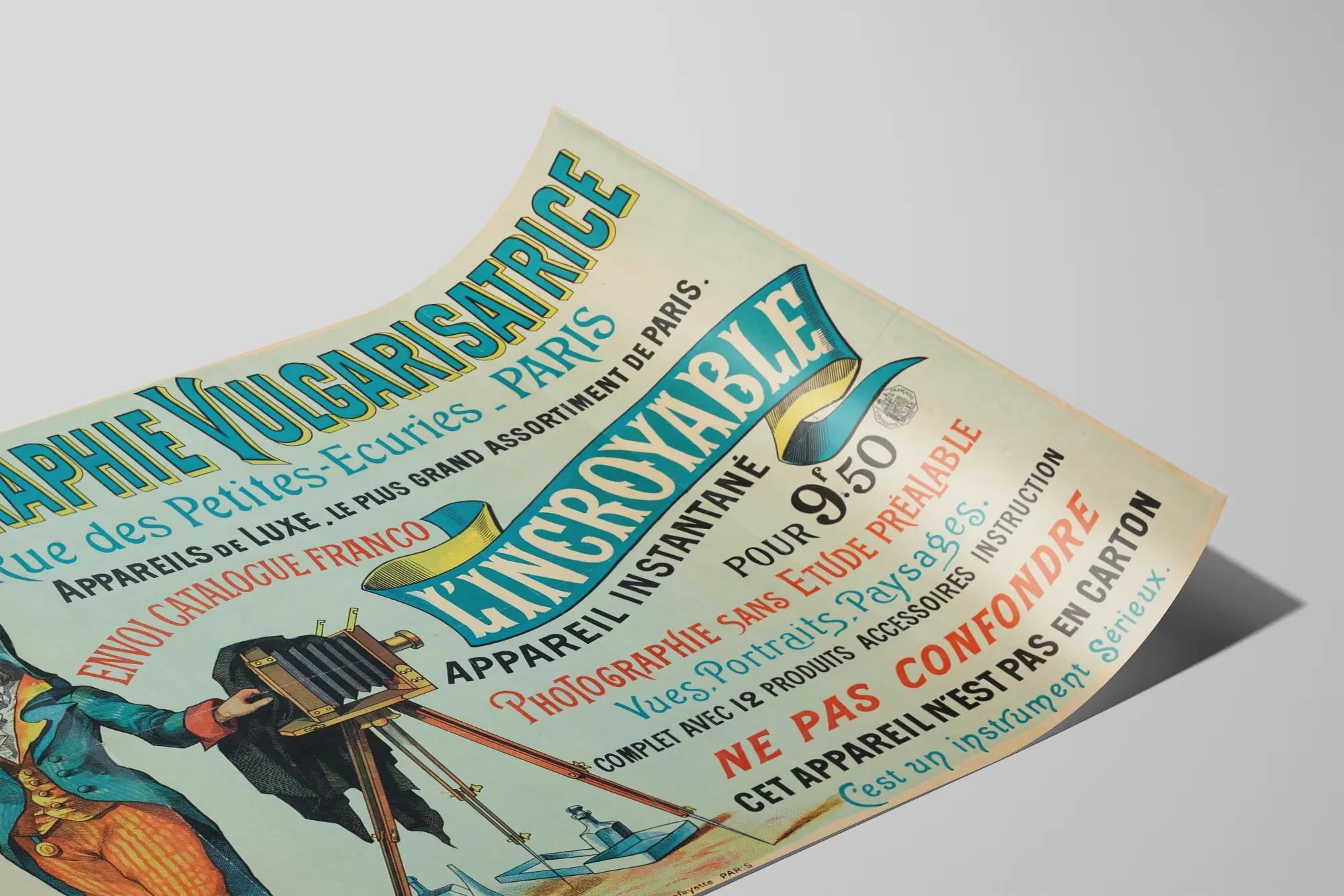 Denna gamla poster väcker fotografi utan förhandsstudie, och antyder enkla bildtagningar som porträtt, landskap och vyer, vilket var en innovation på den tiden. Man hittar även tekniska och reklammässiga referenser, inklusive den parisbaserade butiksadressen, antalet medföljande tillbehör samt varningar om kvaliteten på den presenterade apparaten. Hela sammansättningen utgör ett vittnesmål om dåtidens marknadsföring och är ett mycket estetiskt dekorativt grafiskt föremål.