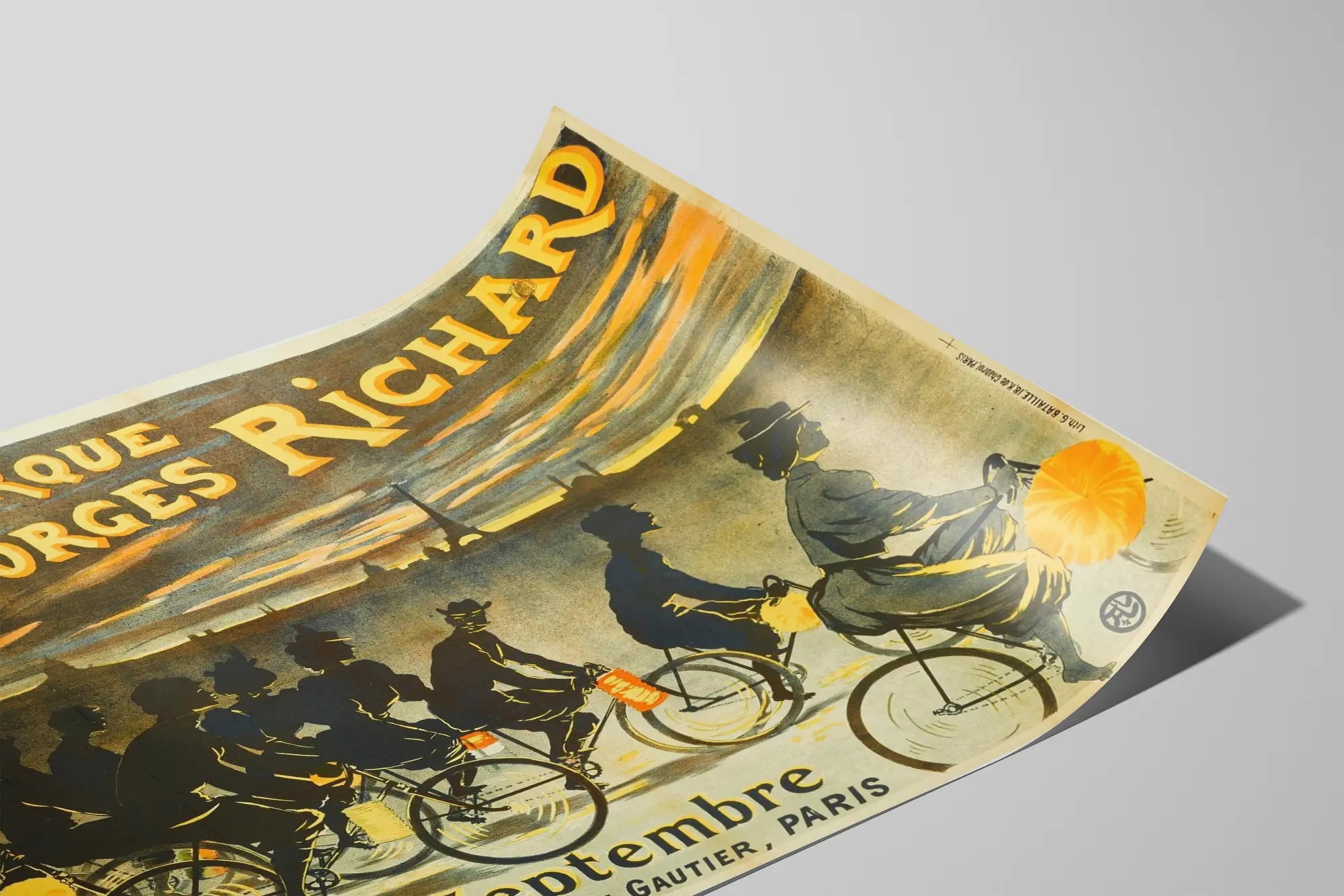 Denna vintage reklamaaffisch lyfter fram varumärket Georges Richard, känt för sin industriella verksamhet i Paris. Föreställande en livlig scen med en grupp cyklister i silhuett mot en parisisk stadsmiljö vid solnedgången, kombinerar denna väggdekoration charm och nostalgi. I bakgrunden skymtar den ikoniska silhuetten av Eiffeltornet, vilket ger en typisk parisisk ram till detta grafiska konstverk. Den orangea himlen blandas med mörka nyanser, vilket framhäver rörelse och scenens dynamik. Texten i stora bokstäver upptar den övre delen av affischen, med den exakta adressen till varumärket på 24 rue du 4 septembre och fabrikerna på 13 rue Théophile Gautier i Paris, vilket hänvisar till en historisk industriell kontext. Denna affisch är perfekt för entusiaster av vintage-inspirerad väggdekoration eller för den som vill tillföra en parisisk och retro känsla till sitt hem. Dess grafiska stil och format som affisch gör den till ett unikt dekorativt inslag, idealiskt för att försköna ett vardagsrum, ett kontor eller en butik. Den varma färgpaletten, som blandar orangea, gula och svarta nyanser, förstärker den konstnärliga känslan och drar till sig blickar naturligt. Oavsett om det är en gammal reklamaffisch eller ett konsttryck, väcker denna väggdekoration ett stycke parisisk industrihistoria med elegans och äkthet. Välj denna Georges Richard-affisch för att berika din samling av vintageaffischer eller för att ge en originell present till cykelentusiaster och fransk kulturarv.