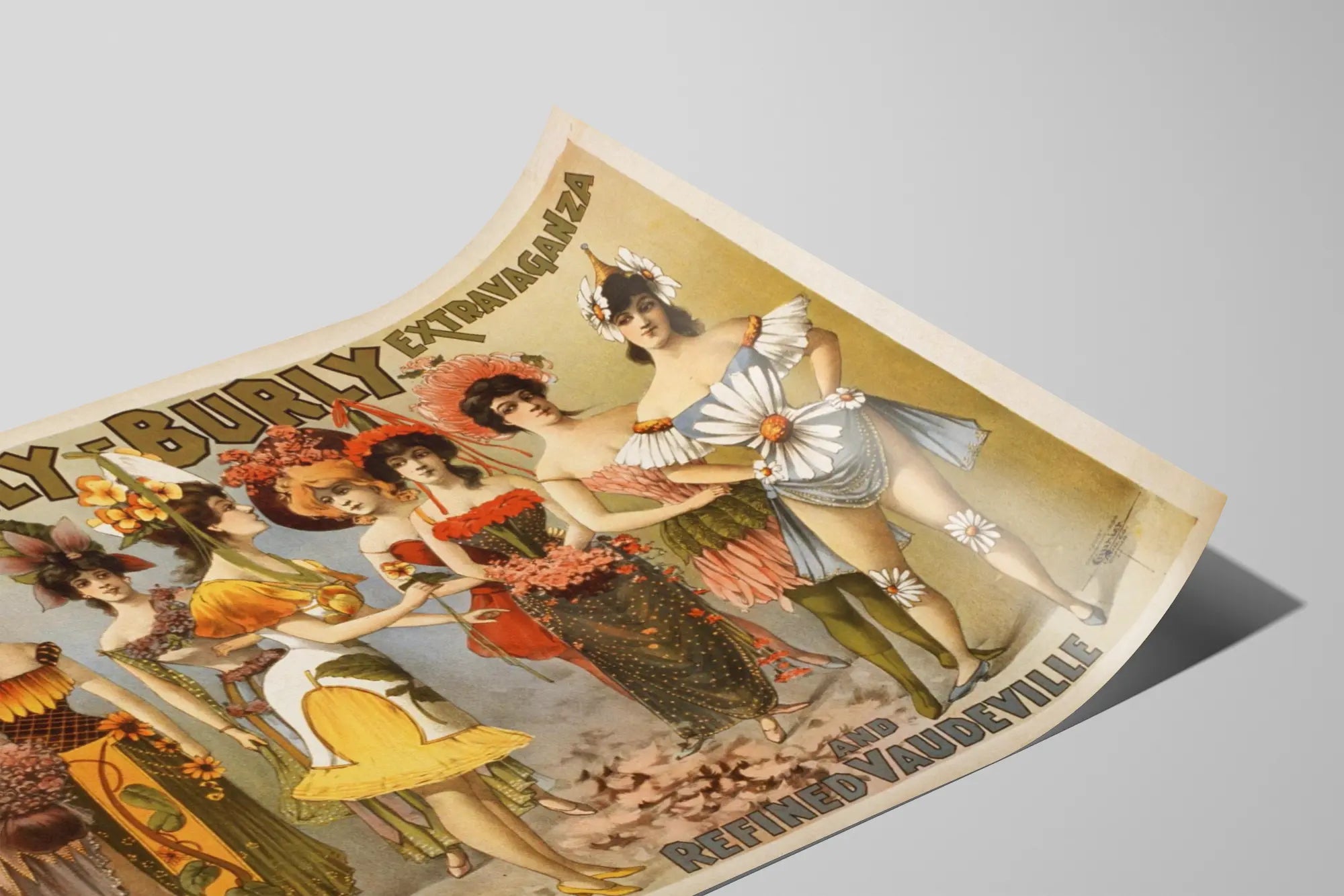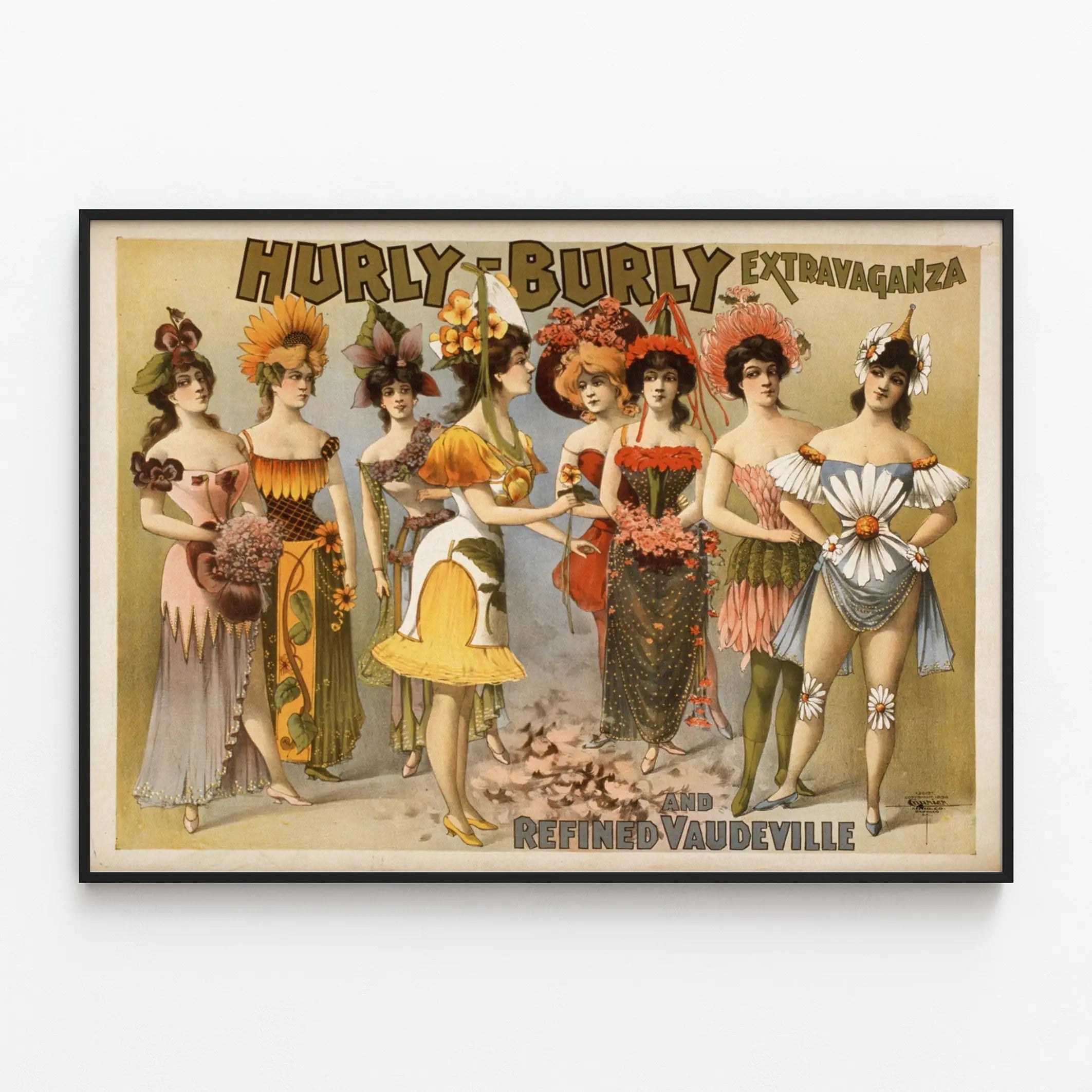 Upptäck detta fantastiska vintageaffisch med titeln « Hurly Burly Extravaganza and Refined Vaudeville », ett verkligt konstverk för väggdekoration som kommer att få allas blickar att vändas. Detta poster visar en grupp på åtta elegant klädda kvinnor, var och en i färgglada och originella kostymer inspirerade av blommor, vilket framhäver en teatralisk stil som är typisk för vaudeville. De varierande kostymerna, fulla av finhet och detaljer, tillför en konstnärlig och retro känsla som effektivt förskönar varje inredning. Denna väggaffisch med gammaldags charm är perfekt för att klä en vägg med sofistikation, och skapar en atmosfär av show och chic fantasi. Färgpaletten, som sträcker sig från varma orangea och röda nyanser till delikata blå och gröna toner, ger en balanserad och behaglig visuell effekt. Detta dekorativa konstverk förstärker den vintagekänsla samtidigt som det lyfter fram den teatrala och festliga estetik som en vaudevilleextravaganza erbjuder. Perfekt att rama in och framhäva i ett vardagsrum, ett kontor eller ett kreativt utrymme, detta vintage väggdekorelement inbjuder till tidsresa och firande av scenkonstens konst. Ge ditt hem en originell och raffinerad personlighet med detta unika poster, en perfekt syntes av show, elegans och konstnärlig tradition.