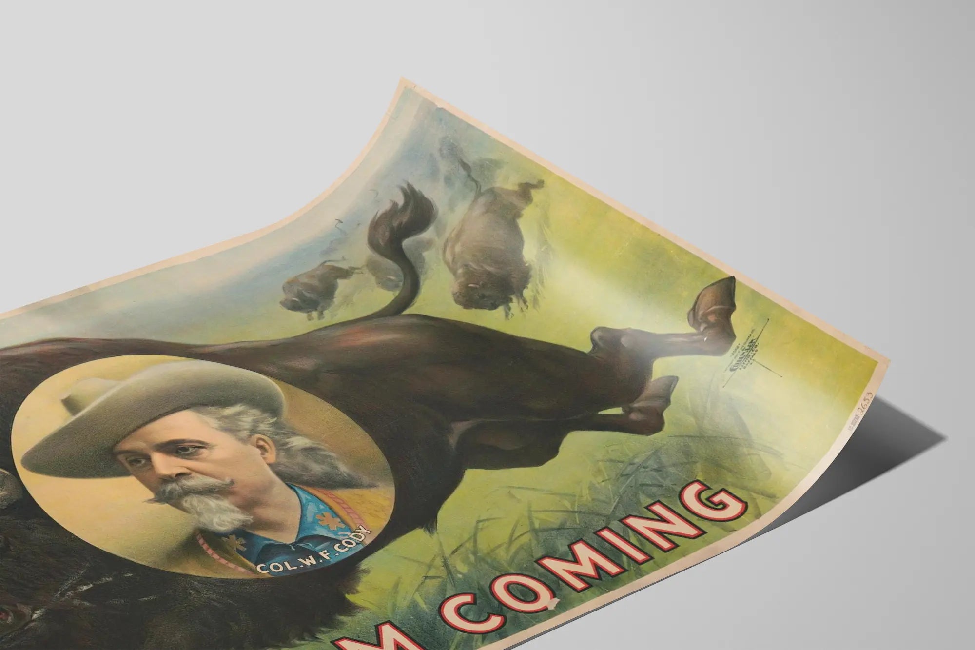 Denna unika vintageaffisch föreställer en dynamisk och ikonisk scen från Vilda västern, med en bison i full fart och ett ovalformat inslag med porträtt av överste W.F. Cody, även känd som Buffalo Bill. Bakgrunden visar en grönskande äng och en dimmig himmel där flera bisons springer i bakgrunden, vilket förstärker intensiteten och rörelsen i kompositionen. Texten "I AM COMING" i stora röda bokstäver med vit kontur dominerar den nedre delen av affischen, vilket ger den ett både slagkraftigt och nostalgiskt utseende. Denna väggdekoration är i linje med de historiska och reklambetonade affischerna från Amerika från slutet av 1800-talet och början av 1900-talet, perfekta för att tillföra en äkta och vintage känsla till ditt hem. Idealisk som väggposter, denna affisch bör ramas in varsamt för att framhäva dess färgglada detaljer och det patinerade pappret. Den passar perfekt för entusiaster av western-inredning, samt för den som söker ett originellt och karaktärsfullt väggdekoration. Denna affisch utstrålar en tidlös charm som passar utmärkt i rustika, vintage eller amerikainspirerade interiörer. Tillsätt en touch av historia och legend till dina väggar med detta kraftfulla och uttrycksfulla väggbild.