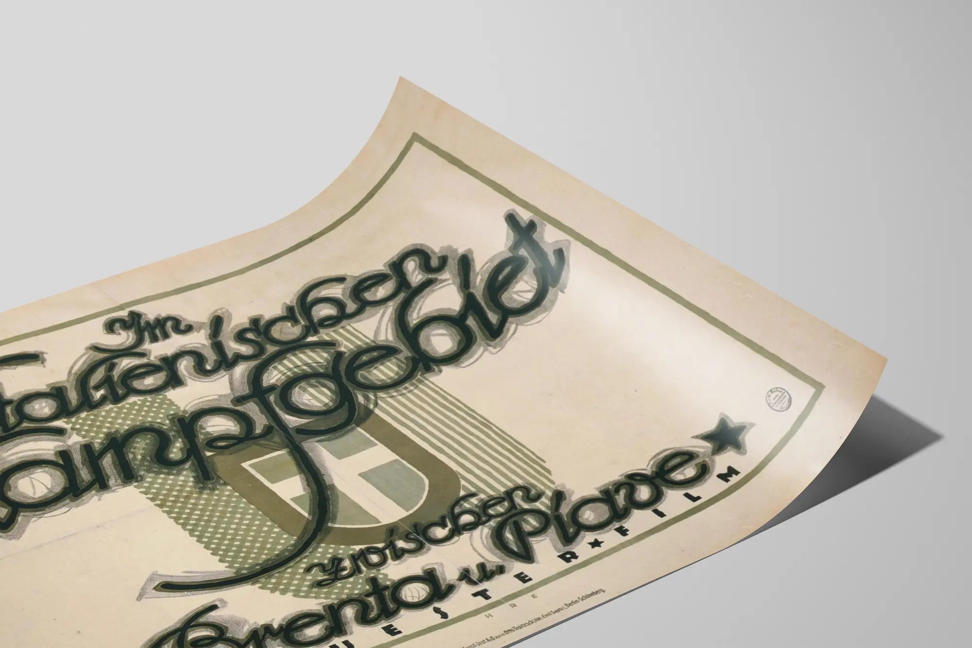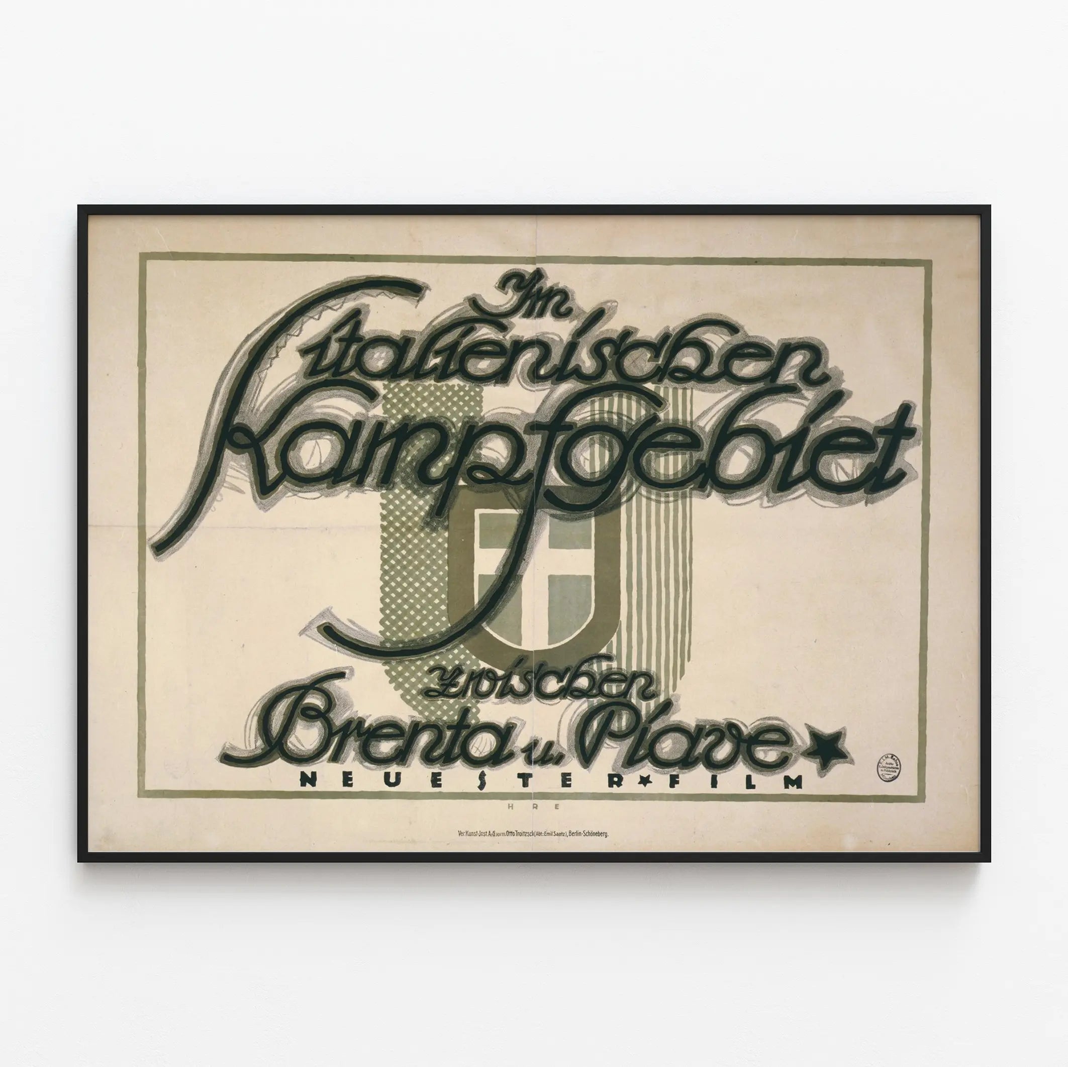 Den vintageaffisch med titeln « Im italienischen Kampfgebiet zwischen Brenta u. Piave » är ett ikoniskt verk för entusiaster av historisk och militär väggdekoration. Den visar en djärv och stiliserad kalligrafi på tyska mot en enkel bakgrund i gröna och beige nyanser, med ett emblem i mitten. Denna grafiska skapelse väcker ett specifikt tema kopplat till ett stridsområde i Italien, troligen från en svunnen tid då floderna Brenta och Piave var strategiska platser. Denna affisch passar perfekt in i ett inrett rum med retro- eller industriell stil, och tillför en äkta och originell prägel. Som väggdekoration utmärker den sig genom sin enkla men slående design, som fångar blickar och samtidigt pryder väggarna med elegans. Oavsett om den placeras i ett vardagsrum, ett kontor eller ett temarum, tillför denna affisch en karaktärsfull och historisk touch, idealisk för konst- och militärhistorieentusiaster. Dess grafiska sammansättning, med flytande linjer och fin ram, understryker intresset för typografisk stil och vintagekompositioner. Denna väggdekoration passar även för kulturella utrymmen, utställningar eller privata samlingar, och erbjuder ett starkt visuellt vittnesmål. Utmärkt för sin enkelhet och visuella kraft är denna affisch ett utmärkt val för att berika en vägg med ett verk som berättar en historia genom sitt textinnehåll och sitt grafiska uttryck. Den är perfekt för den som söker en unik väggdekoration med djup, som speglar en särskild epok eller historisk händelse inskriven i en gammal estetik.