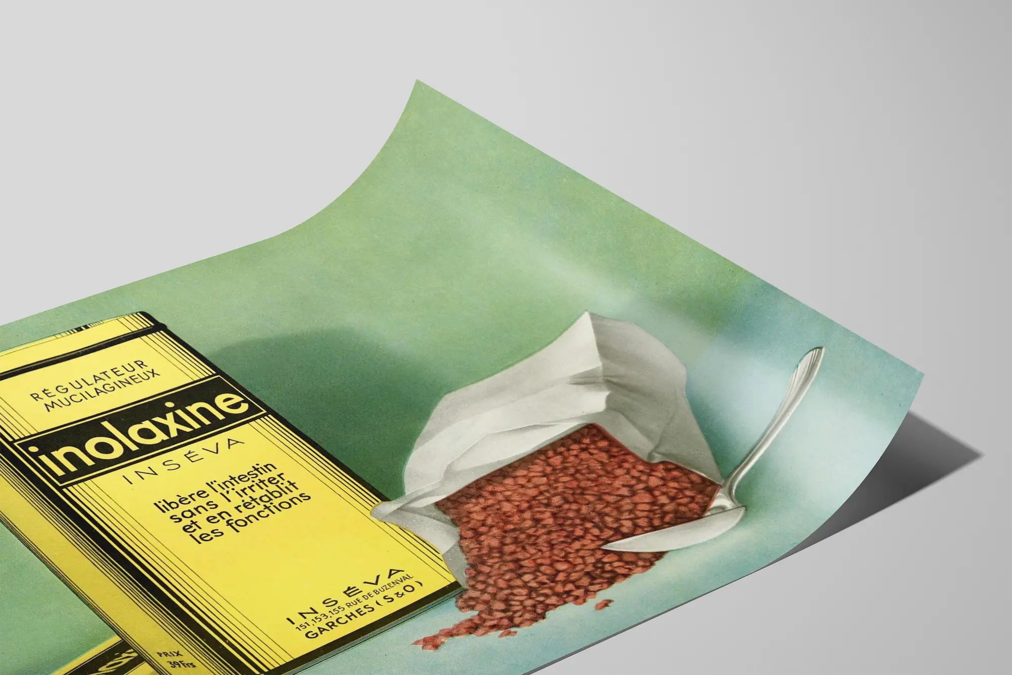 Denna vintageaffisch illustrerar en förpackning från märket Inolaxine, en mukilaginös regulator för tarmen. Den grafiska kompositionen visar en gul metallbox med en svart skylt, tillsammans med ett öppet vitt paket där små röda granulater rinner ut, och en sked placerad bredvid. Bakgrunden i matt pastellgrönt förstärker den retroa känslan och framhäver föremålet i förgrunden. Denna affisch kombinerar enkel estetik med en antydan till industriell nostalgi, och speglar en kommersiell design från tiden. Den är perfekt för vintage väggdekoration, och tillför en äkthetskänsla och originalitet till ett kök, en hälsoklinik eller ett levande utrymme som söker retroatmosfär och gamla grafiska föremål. Den hyllar den funktionella förpackningsdesignen med tydlig typografi, som förenar funktion och elegans. Denna dekorativa tavla återspeglar med sitt grafiska uttryck enkelheten i tidigare reklamkampanjer, där produktpresentationen var direkt och lätt att förstå. Användningen av dämpade och klara färger ger denna väggdekoration ett starkt visuellt intryck utan att bli överbelastad. Denna affisch är ett unikt val för alla som uppskattar väggdekoration i vintage stil, och visar ett enkelt och slagkraftigt reklamhistoria.