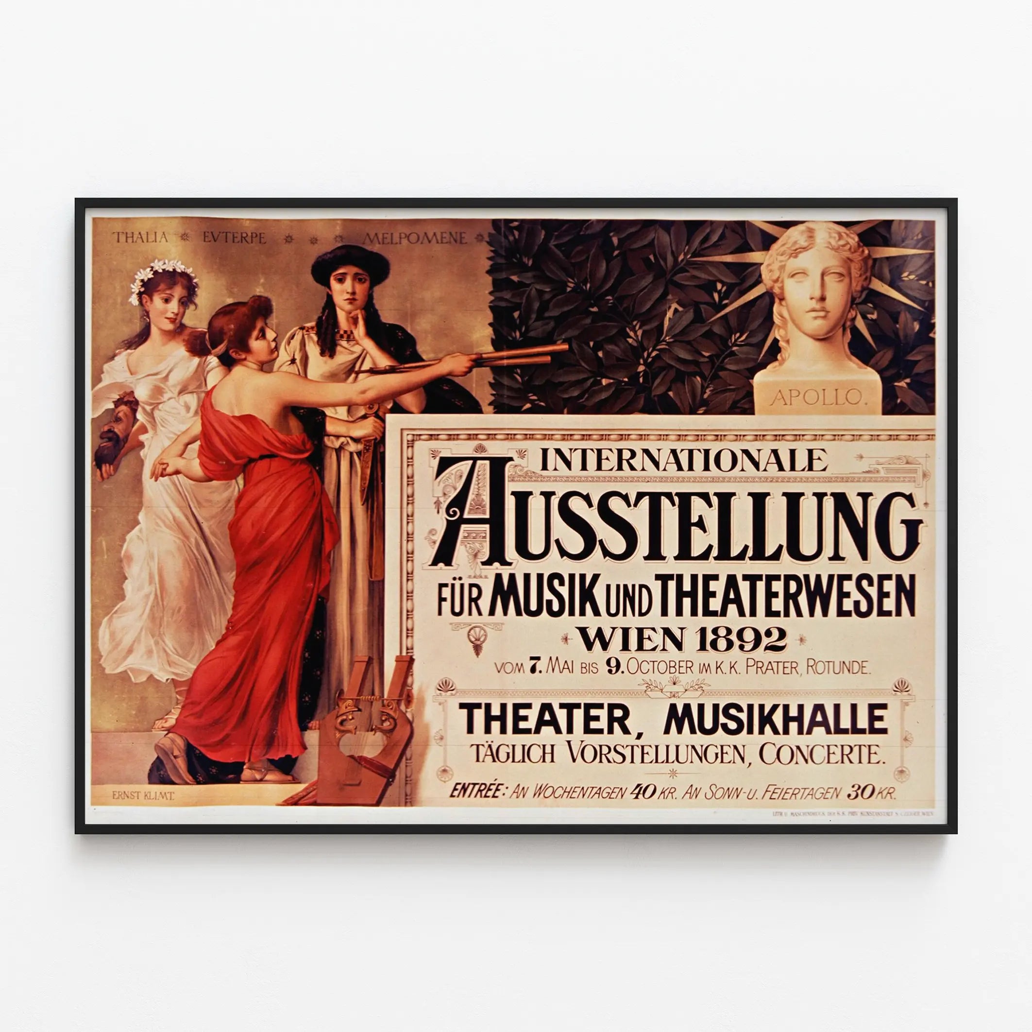 Upptäck denna vintageaffisch som föreställer den Internationella utställningen för musik och teater i Wien 1892, ett viktigt kulturellt evenemang ägnat åt teater och musik i Wien. Detta konstnärliga verk visar tre kvinnliga figurer klädda i klassiska togas, symboliserande muséerna Thalia, Euterpe och Melpomene, kopplade till komedi, musik och tragedi. Till höger finns ett bröst av Apollon med en stiliserad gloria som kompletterar kompositionen, vilket förstärker det mytologiska och konstnärliga temat i denna väggdekoration.