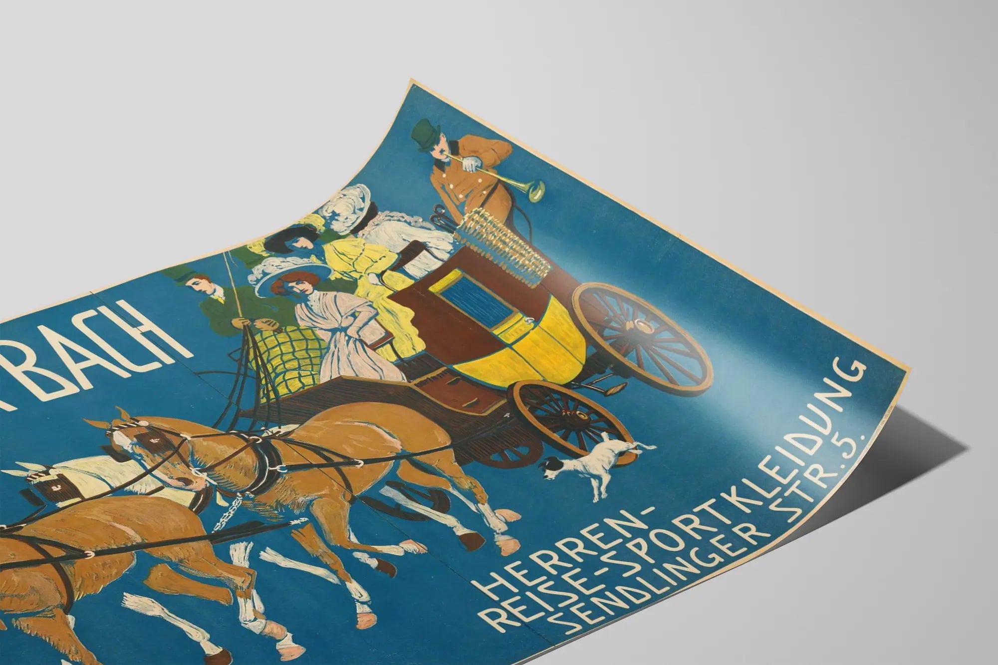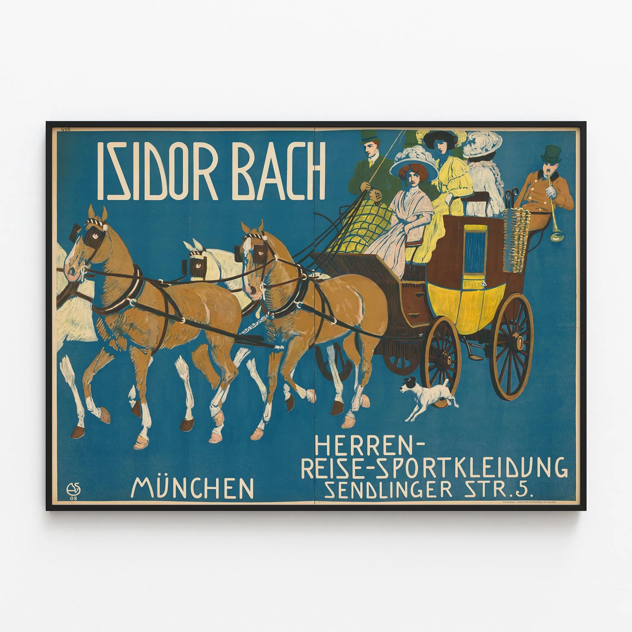 Den här vintageaffischen av Isidor Bach är en perfekt väggdekoration för älskare av gammal konst och retrostil. Den föreställer en elegant vagn dragen av galopperande hästar, med fyra personer klädda i eleganta res- och sportkläder för män, i en miljö som påminner om början av 1900-talet. Den djupblå bakgrunden framhäver de varma nyanserna hos hästarna och kläderna, vilket förstärker den dynamiska och sofistikerade karaktären i scenen. Denna affisch är idealisk för att försköna ett vardagsrum, ett kontor eller en butik, och tillför en känsla av äkthet och klassisk charm. Använd som en dekorativ poster, väcker den tankar om resor, sport och gammal herrmode, och ger inspiration till vintageväggdekoration eller ett inredningskoncept med historisk prägel. Dess omsorgsfulla grafik och harmoniska färger gör den också till ett utmärkt val för ett inramat konstverk. Denna väggdekoration riktar sig till entusiaster av klassisk design, gammal reklamkonst och eleganta reseminnen. Dess konstnärliga stil och noggranna detaljer kommer att fängsla betraktaren och skapa en unik atmosfär i vilket utrymme som helst. Oavsett om det är för en personlig samling eller för att lyfta fram ett kommersiellt utrymme, är denna Isidor Bach-affisch ett oumbärligt inslag i vintageväggdekoration.
