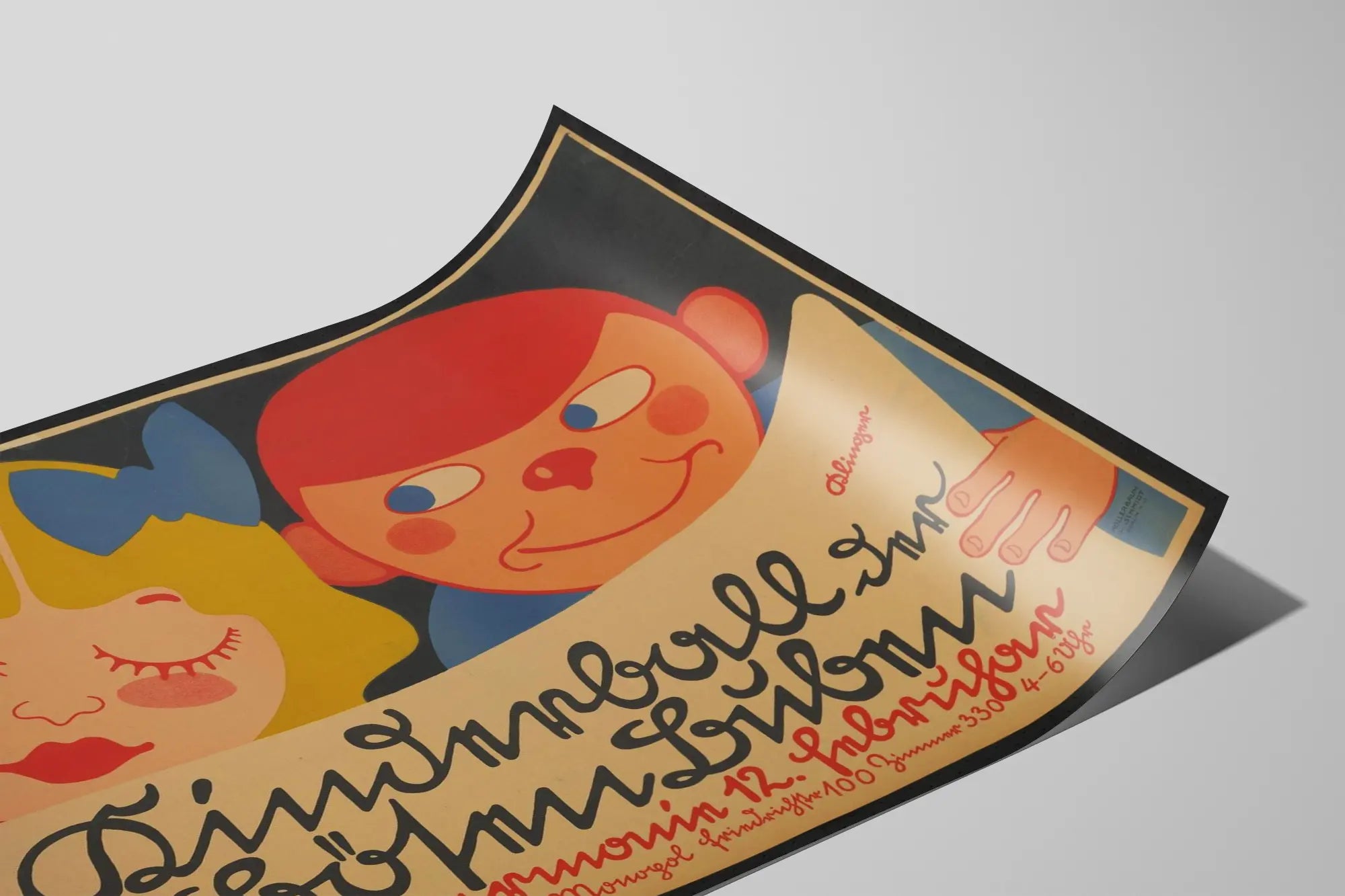 Denna vintageaffisch illustrerar lekfullt och färgglatt två barn, den ena med ett stort blått knut i det blonda håret och ett lugnt uttryck, den andra med ett rött ansikte och ett busigt leende. Den minimalistiska teckningen i platta färger som rött, blått och gult skapar en slående kontrast mot en mörk bakgrund, vilket framhäver figurerna i förgrunden. Denna affisch är prydd med en handskriven inskrift på tyska i mitten, vilket ger en äkta retrocharm till kompositionen. Denna typ av väggdekoration, med enkla men uttrycksfulla linjer, passar perfekt i ett vintage- och samtida inredningsmiljö, och tillför en touch av originalitet och glädje i ett barnrum, lekrum eller vardagsrum. Affischen, med sitt barnsliga grafiska uttryck och varma färger, inbjuder till nostalgi och fantasi, och erbjuder en konstnärlig närvaro som fångar blickar utan att överbelasta utrymmet. Den riktar sig till konstälskare av grafiska verk, gamla posters och unika föremål, som är lätta att rama in eller visa som de är. Denna väggbild, som kombinerar naiv charm och retrostil, är ett perfekt val för att berika en väggdekoration med en touch av humor och glad enkelhet.