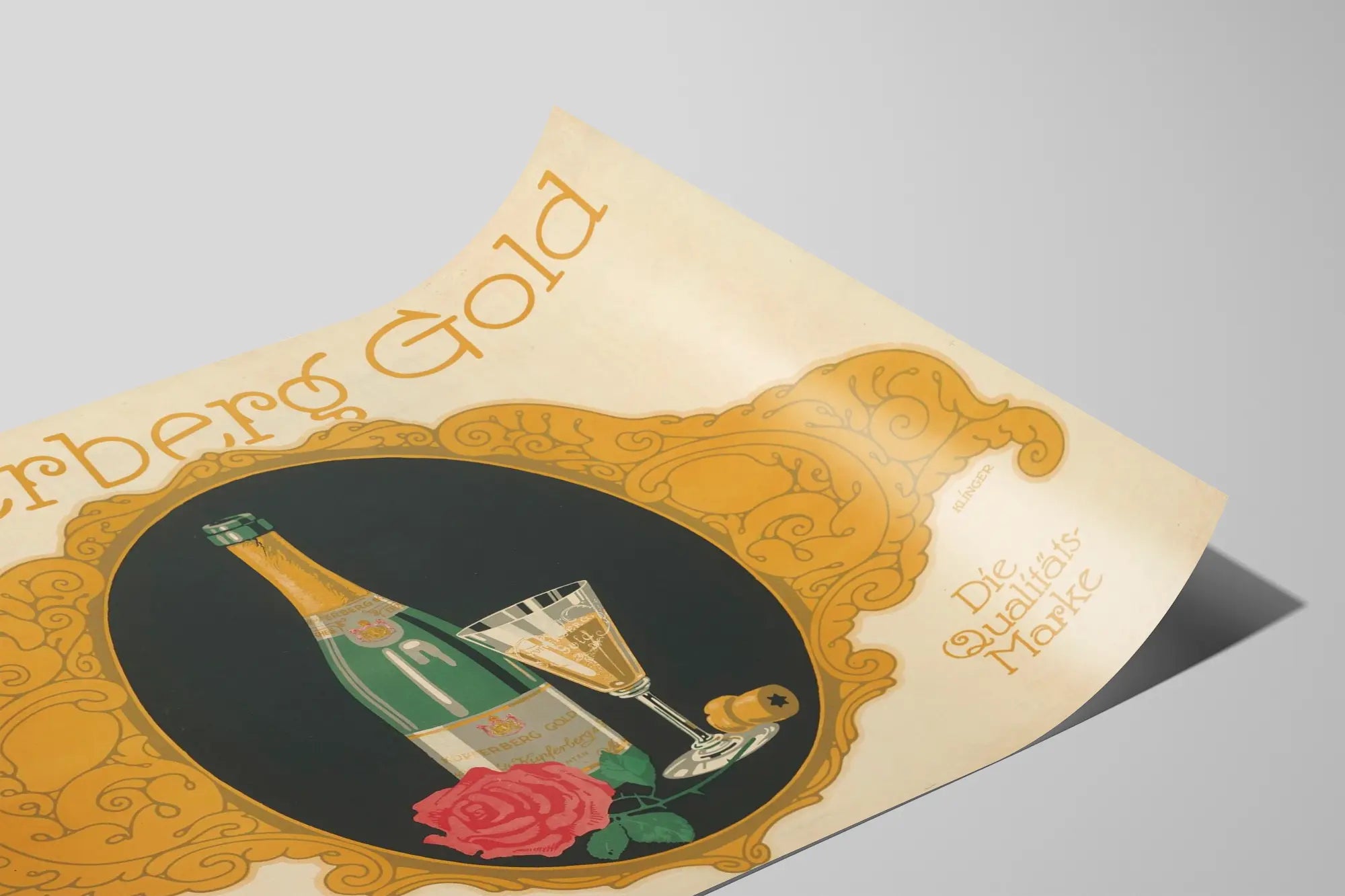 Den här vintageaffischen Kupferberg Gold är ett unikt väggdekorationselement som tillför en touch av elegans och förfining till ditt hem. I centrum av verket finns en flaska mousserande vin Kupferberg Gold, tillsammans med ett vinglas och en försiktigt placerad röd ros, allt inramat av en guldrik ornamenterad dekoration med komplexa mönster. Kontrasten mellan den mörka bakgrunden i medaljongen och den krämfärgade bakgrunden framhäver de illustrerade elementen på ett vackert sätt, vilket skapar en behaglig visuell harmoni.