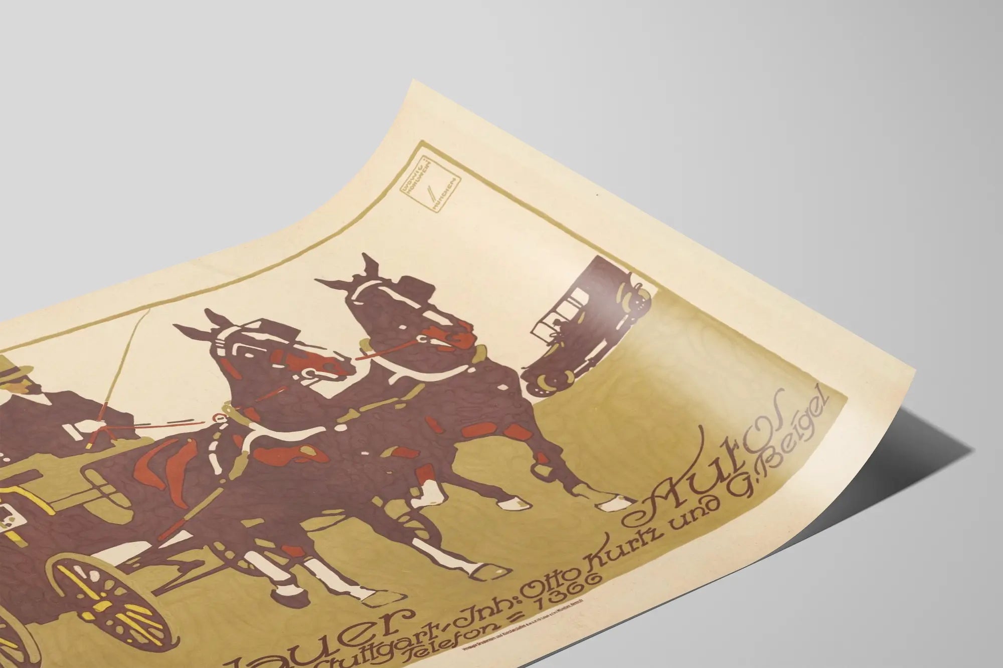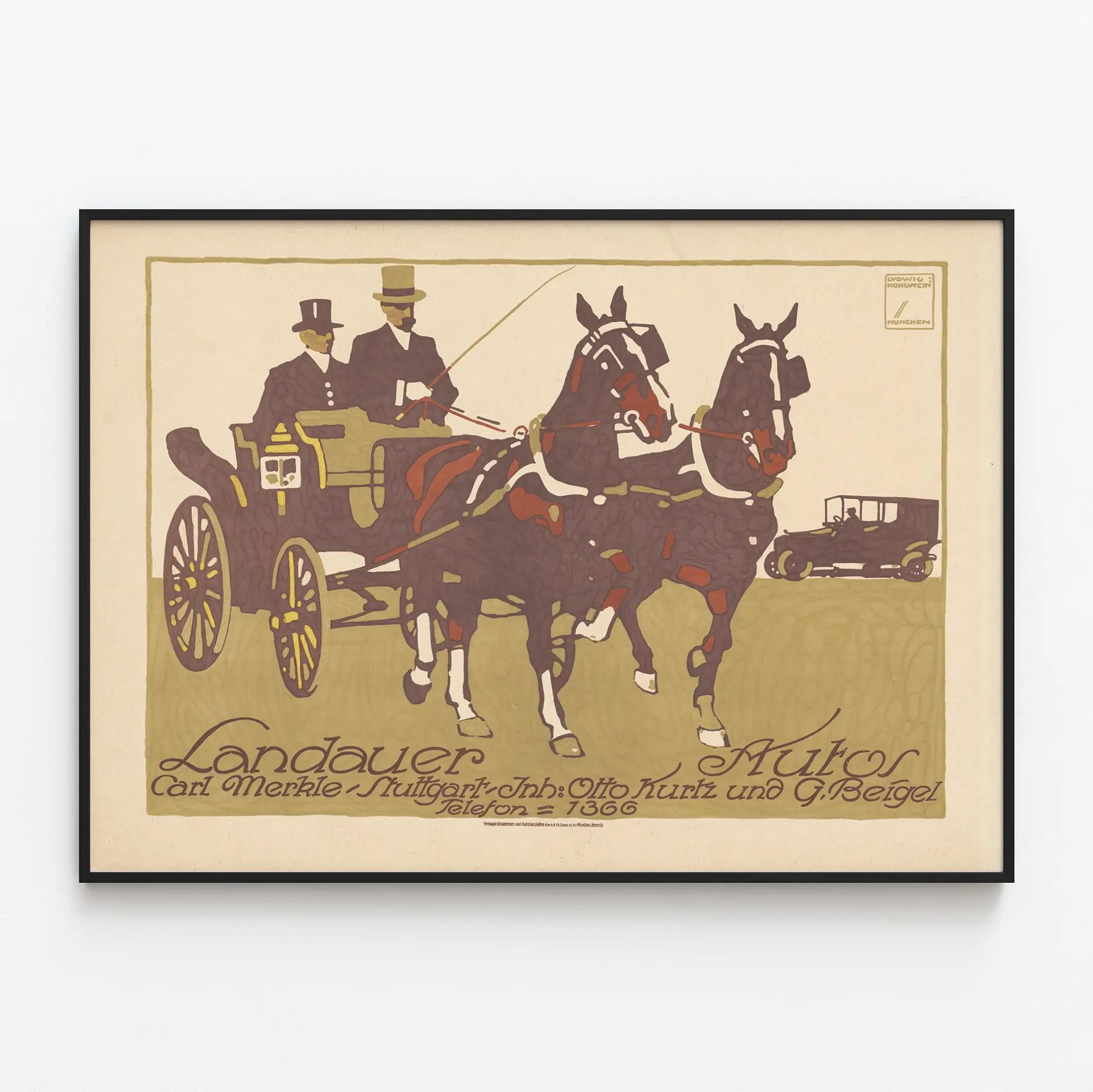 Denna vintageaffisch föreställer en elegant scen som blandar tradition och modernitet, och framhäver Landauer Autos från Stuttgart. Bilden, skapad av konstnären Ludwig Hohlwein, visar två stiligt klädda män i tidsenlig dräkt, med hög hatt, kopplade till en vagn dragen av två hästar. I bakgrunden understryker ett gammalt fordon övergången mellan traditionella transportmedel och moderna bilar. Användningen av en ren grafisk stil och en palett av dämpade men kontrasterande färger ger ett mycket uppskattat retrocharm för väggdekoration. Denna affisch är perfekt för konstälskare, transporthistorieentusiaster eller alla som vill tillföra en touch av vintageelegans till sitt hem. Den passar lätt i vardagsrum, kontor eller ett rum för temainredning. Den kan komplettera en samling av gamla affischer eller fungera som ett distinkt inslag i en modern inredning. Denna väggbild speglar också den tyska konstnärliga skickligheten med en balanserad komposition, där hästarnas och vagnens rena linjer dominerar scenen och framhäver den dynamik och sofistikering som kännetecknar denna epok.