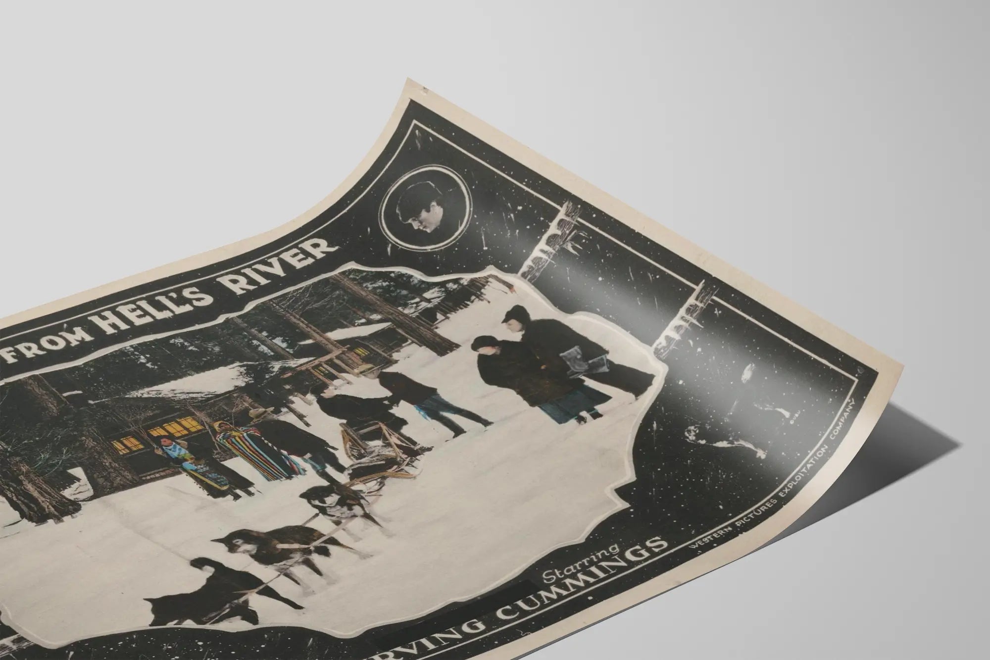 Upptäck denna vintageaffisch med titeln "Man from Hell's River", ett verkligt konstverk för väggdekoration inspirerat av klassisk film. Denna affisch visar en snöig scen där flera personer samlas kring en hundsläde, i en skogsmiljö med trähus. I toppen finns två cirkulära ramar, vardera med porträtt av en person, vilket förstärker den dramatiska och historiska känslan i denna illustration. Titeln "Man from Hell's River" är tydligt synlig högst upp på affischen, tillsammans med namnet Irving Cummings, vilket ger ett äkta och nostalgiskt intryck till detta plakat. Perfekt för entusiaster av retrostil på väggarna, passar denna affisch lätt in i ett vardagsrum, ett kontor eller ett hemmabio, och tillför en touch av elegans och historia. De finare detaljerna, som hundarna i förgrunden och de varma klädda silhuetterna, antyder en vintrig atmosfär och en dramatisk stämning. Denna väggbild är ett utmärkt val för den som vill dekorera sina väggar med ett unikt föremål fullt av historia, som förenar den gamla filmens värld med vintage-stilen. Oavsett om det är för en personlig samling eller för en tematisk inredning, kommer denna "Man from Hell's River" affisch att fängsla betraktarens blick och berika ditt utrymme med en stark personlighet och en äkthetskänsla.