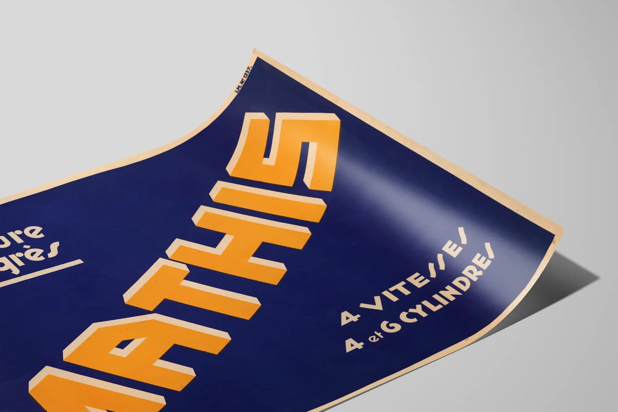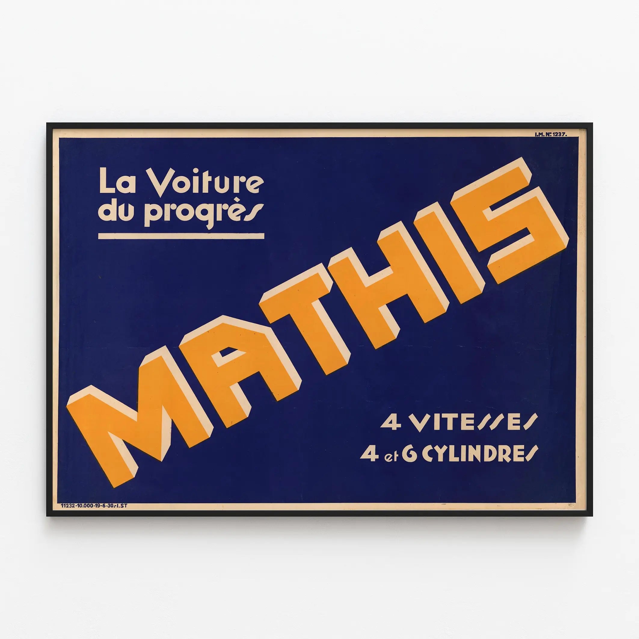 Den här vintageaffischen hyllar varumärket Mathis med sloganen « Framtidens bil ». Dess enkla och slagkraftiga grafiska design använder en mörkblå bakgrund, vilket framhäver namnet 'MATHIS' i stora, orange bokstäver med en vit skuggeffekt, vilket skapar ett starkt visuellt kontrast. Texten nämner också "4 växlar, 4 och 6 cylindrar", vilket understryker den tekniska prestandan hos Mathis-bilarna från den tiden. Denna affisch utmärker sig genom sin art déco-typografi, som ger en retro och elegant touch som tilltalar bilentusiaster och vintage väggdekoration. Perfekt för industriell väggdekoration eller ett inre som fokuserar på bilens historiska aspekt, tillför denna poster färg och äkthet. Den passar lika bra i ett vardagsrum, ett kontor eller en verkstad för samlare av gamla affischer. Denna väggbild är en inbjudan till tidsresa, som speglar bilens teknologiska utveckling och mekaniska framsteg. Ett unikt föremål som kombinerar grafisk konst och industriarv, perfekt för en affischsamling eller ett originellt dekorativt utrymme.