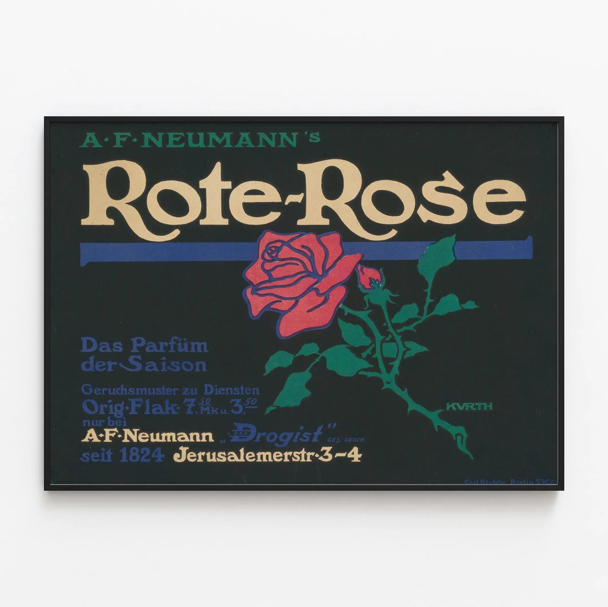 Upptäck denna vintageaffisch med titeln "Rote Rose", ett konstnärligt verk som är ägnat att marknadsföra en säsongsparfym. Denna reklamaffisch har en elegant och ren design, som framhäver en stiliserad röd ros tillsammans med ett tydligt typografiskt textstycke. Huvudmotivet är en livfull röd ros med mörkgröna blad och stjälkar, som harmoniskt kontrasterar mot en svart bakgrund. Den tyska texten visar produktnamnet "A.F. Neumanns Rote Rose" samt ytterligare information som "Das Parfum der Saison", vilket betyder "Säsongens parfym". Denna affisch är ett utmärkt väggdekorationstips för entusiaster av vintagekonst och gamla annonser. Den kan försköna ett inomhusrum genom att tillföra en touch av retro elegans och ett historiskt charmigt uttryck, typiskt för illustrerade affischer från början av 1900-talet. Denna unika väggdekoration kan användas i olika utrymmen, som ett vardagsrum, en butik eller ett område för dofter, för att ge ett dekorativt utseende som är både nostalgiskt och förfinat. Affischen leker med starka färgkontraster: rött, grönt, blått och beige, väl samordnade mot en mörk bakgrund. Denna poster kommer att uppskattas för sin enkla grafiska stil och sitt tydliga budskap kring en doftande produkt, vilket gör den till ett perfekt dekorationsobjekt för entusiaster av vintageannonser och retrodesign. Använd denna affisch som en väggmålning för att höja din väggdekoration med ett visuellt tilltalande och tidlöst motiv.