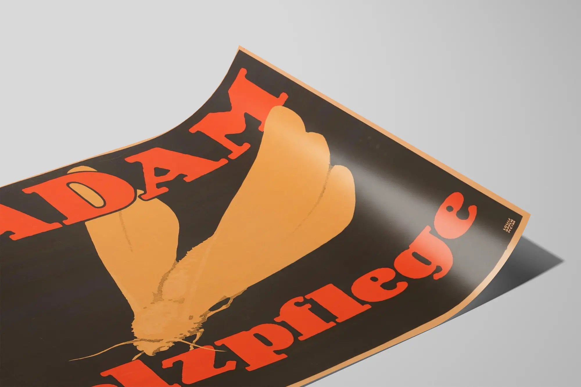 Ge ett retro och konstnärligt intryck till ditt utrymme med denna vintageaffisch S.ADAM Pelzpflege. Den grafiska stilen på postern framhäver en stor minimalistisk illustration av en insekt med utbredda vingar, i nyanser av ockra och beige, placerad på en djup svart bakgrund som skapar en slående kontrast. De ljusröda versalerna "S.ADAM" och "Pelzpflege" ramar in motivet på ett harmoniskt sätt, vilket ger en stark identitet till denna väggdekoration. Perfekt för entusiaster av vintage design eller för de som älskar enkla men uttrycksfulla kompositioner, passar denna affisch perfekt in i en industriell, modern eller eklektisk inredning för att pryda väggen med originalitet och karaktär. Det rena grafiska uttrycket och de begränsade färgvalen gör den till ett dekorativt inslag som fångar blickar utan att överbelasta rummet. Oavsett om det är i ett vardagsrum, ett kontor eller en hall, tillför denna vintageväggdekoration en varm och kulturell atmosfär. Dess tjocka papper garanterar långvarig hållbarhet, vilket gör att du kan försköna din vägg under många år framöver. Denna affisch är också ett utmärkt val för en samling av gamla affischer eller grafisk design, och berikar din dekorativa värld med ett unikt stycke med tydlig stil och slående typografi. Ge dina väggar en visuell själ med denna S.ADAM Pelzpflege-affisch, en sann klassiker inom reklamkommunikation som passar för en äkta och stilfull väggdekoration.