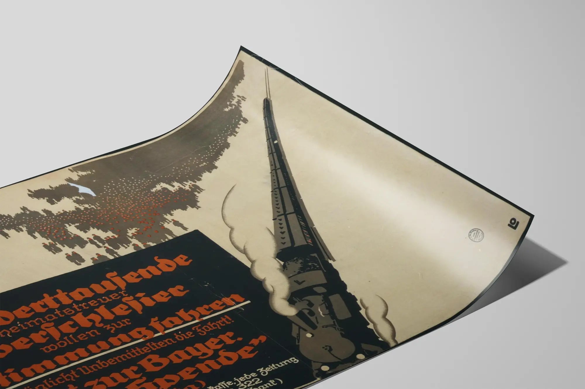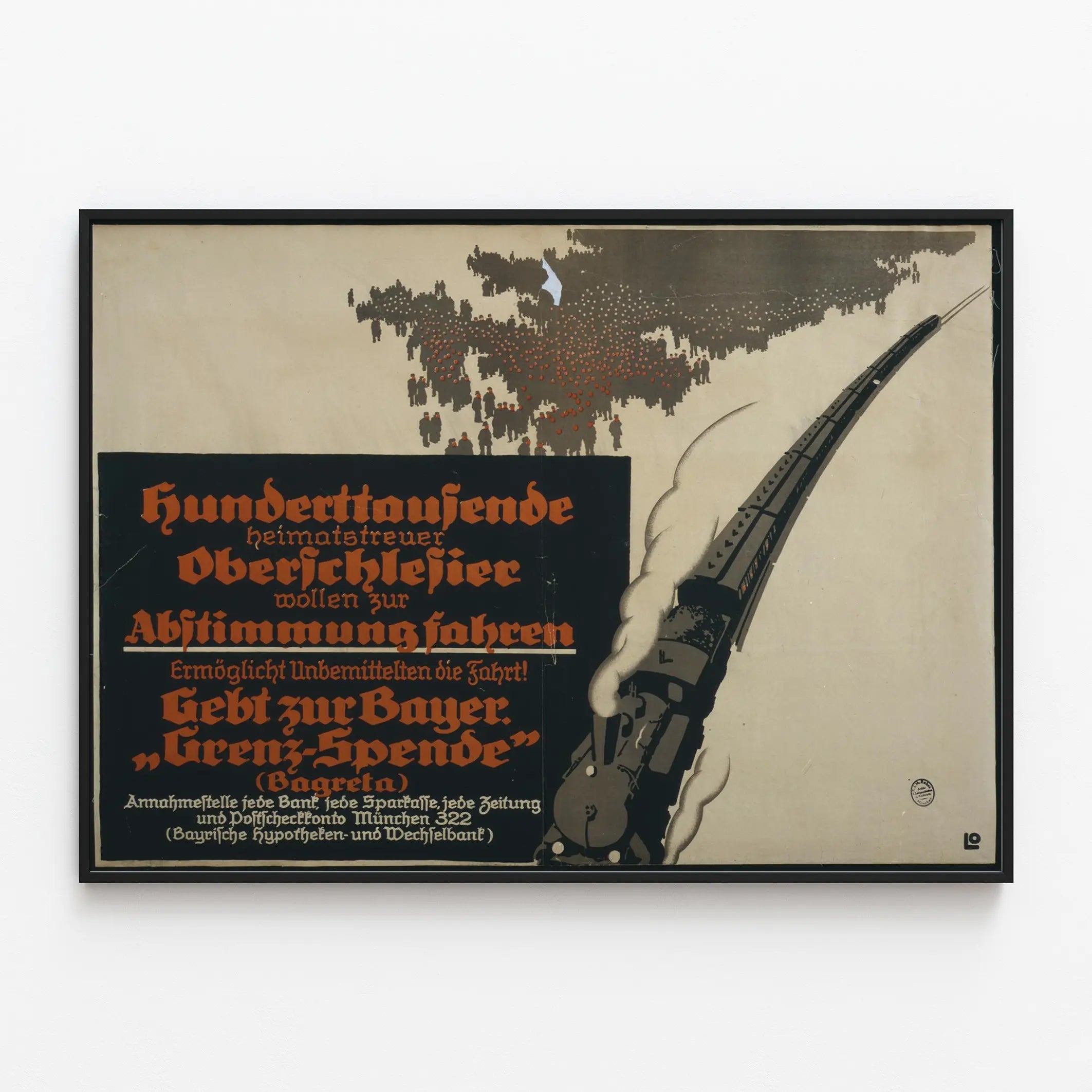 Den här vintageaffischen föreställer ett stiliserat ånglok som skyndar åt höger, omgivet av en tät skara mörka silhuetter av människor mot en ljus bakgrund, symboliserande invånarna i Övre Schlesien (Oberschlesien) som är redo att gå till valurnorna. Bilden väcker ett upprop att ekonomiskt stödja väljarnas resa genom en insamling som syftar till att underlätta deras transport, vilket uttrycks i ett textmeddelande i gotisk röd och vit typografi på svart bakgrund. Denna grafiska komposition kombinerar historisk propaganda med en kontrasterande design präglad av rena former och en begränsad färgpalett av svart, rött och beige. Denna affisch, perfekt för vintage- och historisk väggdekoration, passar utmärkt för entusiaster av politiska affischer och tidsenligt design, och tillför en äkthetskänsla samt en reflektion av ett gammalt civilt engagemang i ett modernt hem.