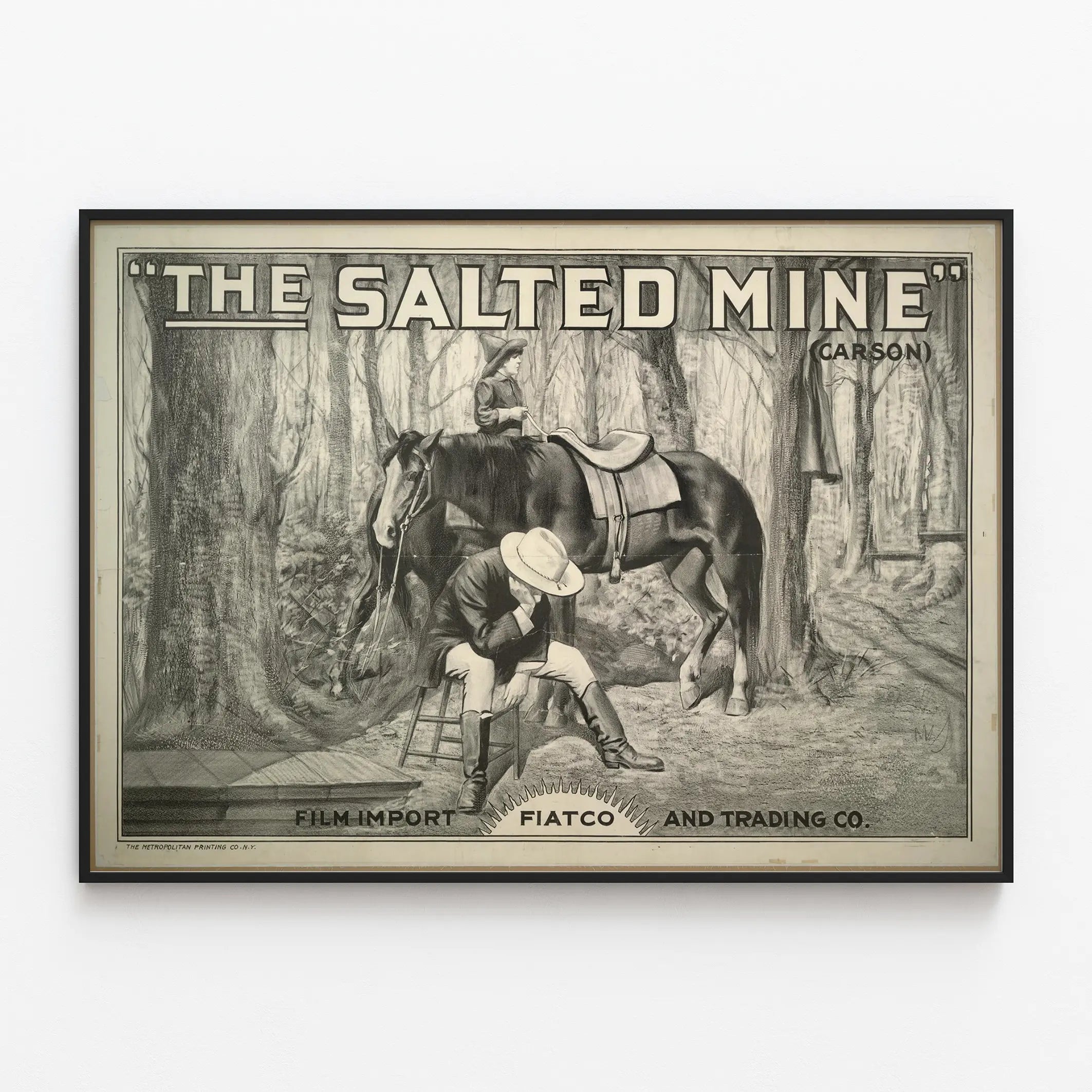 Ge en touch av äkthet och historisk charm till ditt hem med denna vintageaffisch med titeln "The Salted Mine". Denna väggdekoration i svartvitt fångar en ikonisk scen från Västern, där en man sitter på en pall, med huvudet vilande i handen, i en meditativ pose bredvid en häst som är sällskapsdjur till en ridande kvinna. Denna väggplansch, inspirerad av västern, framkallar en atmosfär som är både nostalgisk och dramatisk, perfekt för entusiaster av amerikansk historia och naturliga scener. Utskriven av The Metropolitan Printing Co. New York, utmärker sig denna affisch genom sin finstämda teckning som prioriterar blyertsskissens uttryck, med noggranna detaljer av skogsbältet i bakgrunden samt av figurerna och hästen. Dess grafiska stil i svartvitt gör den till ett sober och elegant dekorativt inslag, som passar lika bra i ett vardagsrum, ett arbetsrum som ett tematiskt utrymme för film eller tidsenliga äventyr. Texten "The Salted Mine" i fet versal stil i toppen av affischen ger en retro och dramatisk effekt som förstärker dess vintage-estetik. Denna unika pjäs hänvisar också till importföretag för filmer (Film Import Fiatco and Trading Co.), vilket tillför en extra historisk dimension till denna väggdekoration. För en originell väggdekoration passar denna vintageaffisch perfekt ihop med element av trä eller läder, typiska för västernmiljöer, för att skapa en varm och äkta atmosfär. Oavsett om det gäller en samling affischer, filminspiration eller ett tematiskt inredningsval, erbjuder denna "The Salted Mine" affisch ett starkt visuellt intryck och en tidlös stil som uppskattas av entusiaster av äkta väggdekoration.