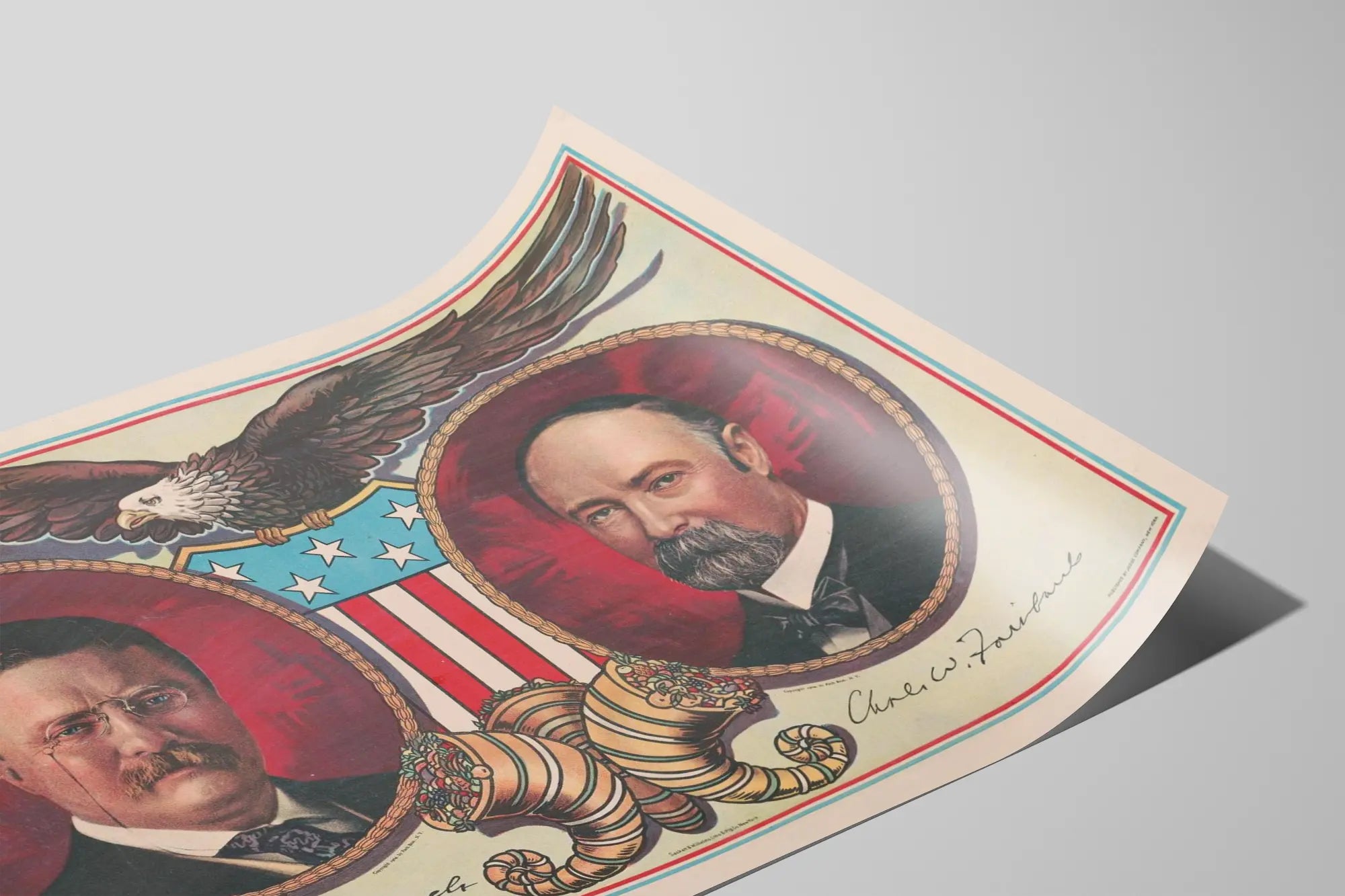 Denna vintageaffisch föreställer två ovalramade porträtt, Theodore Roosevelt och Charles W. Fairbanks, en framstående figur i amerikansk historia. Placerade sida vid sida mot en djup röd bakgrund, lyfts dessa porträtt fram av en guldram med flätad design som ger ett ädelt och klassiskt utseende. I mitten finns ett vapensköld i USA:s färger, med vita stjärnor på blå bakgrund och röda och vita ränder, som symboliserar amerikansk styrka och enhet. Ovanför denna komposition, en stor amerikansk örn med utbredda vingar och detaljerade fjädrar, förstärker det patriotiska och symboliska temat för denna väggdekoration. De två namnen, skrivna under porträtten, tillför en känsla av äkthet och historia till denna illustration. Längst ner finns två horn av plenty fyllda med blommor och frukter, element som traditionellt förknippas med överflöd och välstånd, vilket ger en extra dekorativ dimension. Denna historiska affisch är perfekt för en vintage, politisk eller patriotisk väggdekoration, som tillför elegans och en atmosfär fylld av historia i ett inomhusmiljö. Oavsett om det är i ett kontor, ett vardagsrum eller ett utställningsrum, framstår detta affisch som ett rikt dekorativt element fullt av symboler, som lyfter fram viktiga historiska figurer i en tidlös stil. Tack vare sina djupa färger och sitt distinkta grafiska uttryck passar denna vintage väggmålning perfekt i varje samling av retroaffischer som lyfter fram amerikansk historia och traditionell inredning.