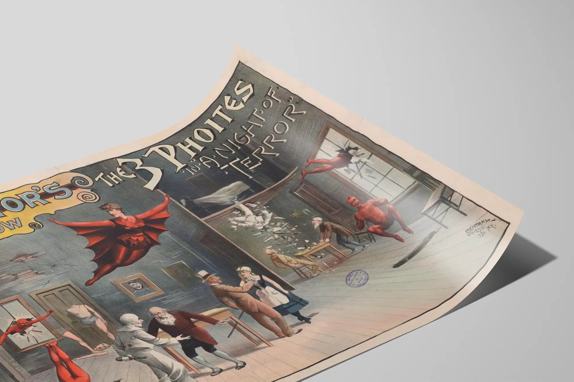 Den här fängslande vintageaffischen föreställer "Tony Pastors stora show" och föreställningen med titeln "De tre Phoites i en natt av skräck". Med en surrealistisk och teatralisk scenografi väcker denna väggdekoration en mystisk och fantastisk atmosfär där mänskliga figurer och röda varelser som verkar demoniskt fantastiska rör sig i en sliten inomhusmiljö. Affischen framhäver en rad överraskande visuella effekter, såsom svävande figurer, skiftande silhuetter samt krossade element och spöklika framträdanden. Denna gamla reklambild, med sin konstnärliga stil från 1800- eller tidigt 1900-tal, förflyttar betraktaren till en värld av scenkonst från den tiden där illusion och spänning blandas. Perfekt för en originell och karaktärsfull väggdekoration, ger denna affisch en retro och gåtfull prägel till ditt hem, studio eller underhållningsutrymme. Färgvalet och detaljrikedomen förstärker den dramatiska och fängslande karaktären av denna illustration, idealisk för entusiaster av historiska och mystiska dekorationer. Denna vintageaffisch är ett utmärkt inslag för att berika en samling av gamla affischer eller ge liv åt en vägg präglad av teater, underhållning och fantasi.