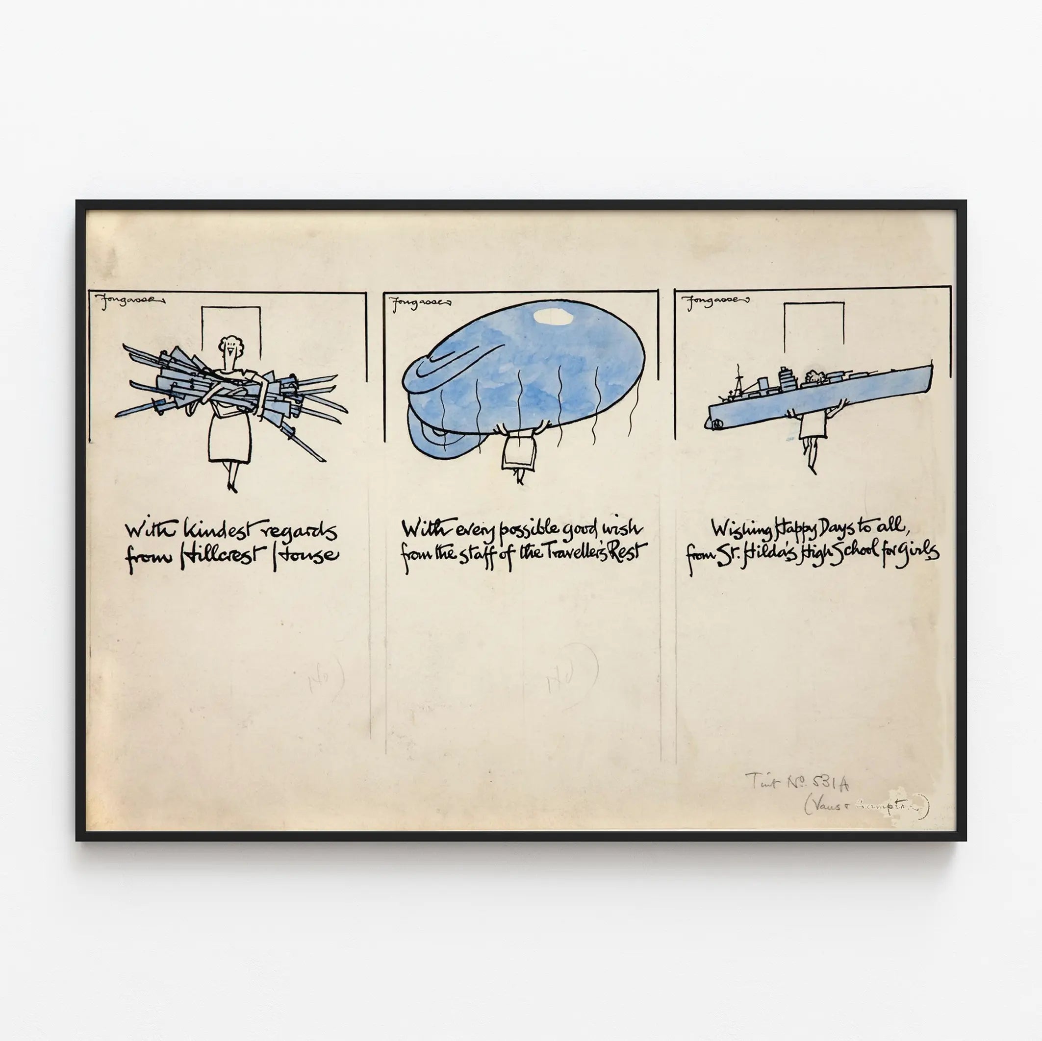 Upptäck detta originella vintageaffisch som illustrerar tre kvinnliga figurer tecknade i en tecknad stil. Varje karaktär håller ett symboliskt föremål: den första kvinnan bär en grupp gevär, den andra lyfter en stor blå ballong, medan den tredje är avbildad med ett stort krigsfartyg. Denna väggdekoration leker med kontrasten mellan enkelheten i linjeteckningen och användningen av färg endast på vissa element. Varje vignett är försett med ett handskrivet engelskt meddelande som verkar vara hälsningar från olika institutioner, vilket tillför en berättande och historisk dimension till verket. Detta affisch är perfekt för den som gillar originell väggdekoration, som kombinerar humor och ikonografiska referenser, idealiskt för ett retro- eller eklektiskt inredningsstil. Dess lätta och rena stil gör den också till ett intressant val för ett kontor eller ett rum för kreativitet. Verket visar en triptyk-komposition och en visuell harmoni baserad på svart och blått, vilket förstärker dess grafiska och tilltalande karaktär. Oavsett om det ska pryda en vardagsrumsvägg, ett bibliotek eller ett konstnärligt utrymme, kommer detta unika affisch att tillföra en känsla av äkthet och personlighet till din inredning. Du kommer att uppskatta detta poster för dess enkla men uttrycksfulla design, som blandar illustration och handskrift i en mycket trendig vintageatmosfär.