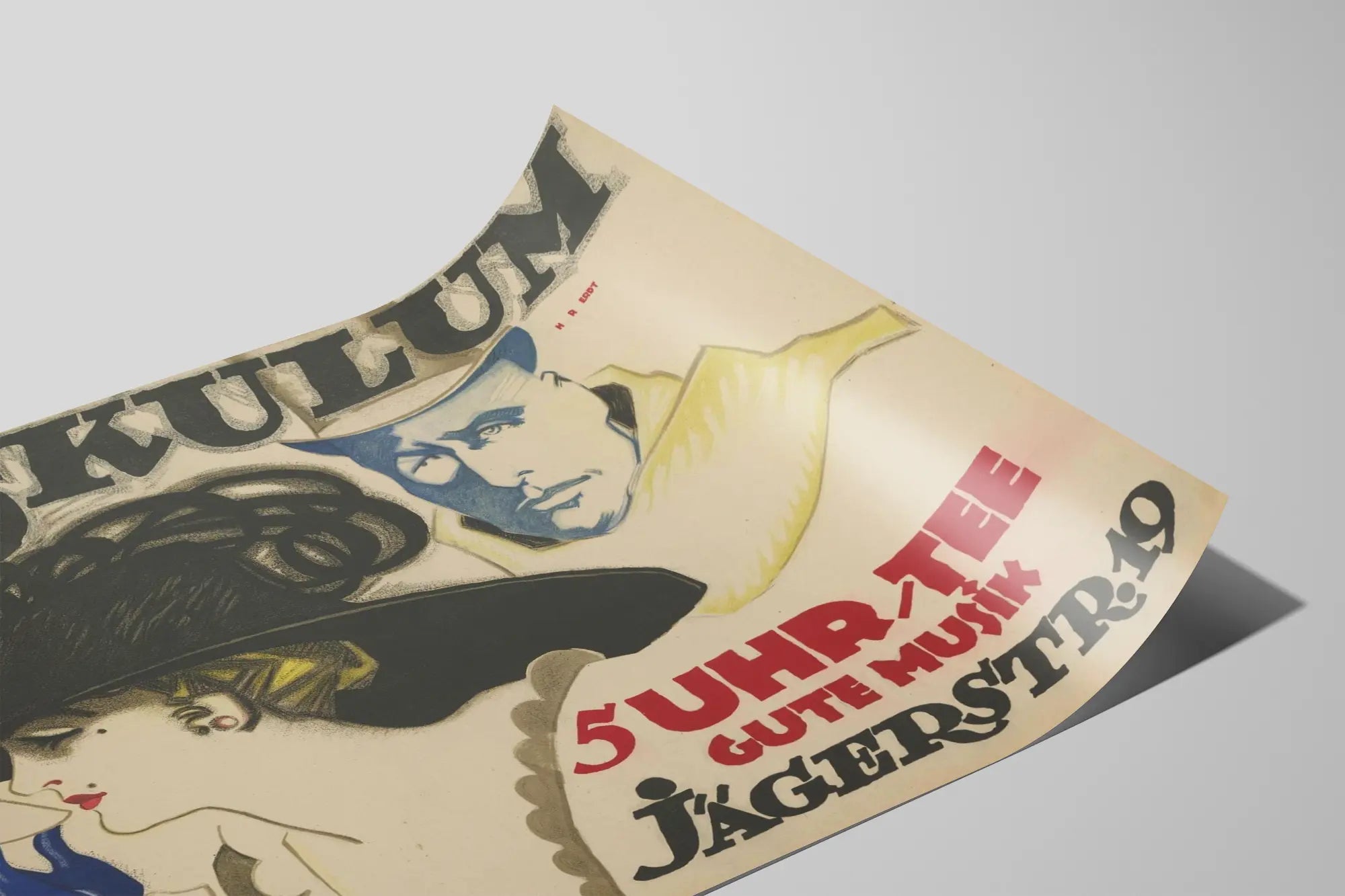 Ge en touch av elegans och retrocharm till ditt hem med denna vintageaffisch Tuskulum 5 Uhr Tee. Denna art déco-inspirerade poster skildrar ett elegant par i en sofistikerad atmosfär: en kvinna med bred hatt i svart håller ett glas i vitt glas, tillsammans med en man med intensiv blick, iklädd en ljus hatt. Mättade, dämpade nyanser dominerar, med inslag av svart, beige, blått och rött som tillför dynamik och kontrast till denna grafiska komposition. Denna väggdekoration är perfekt för att ge karaktär till ett vardagsrum, matsal eller ett avkopplingsutrymme. Texten i djärva bokstäver « TUSKULUM » och « 5 UHR TEE GUTE MUSIK JÄGERSTR. 19 » ger en typisk vintagekänsla som är vanlig i reklamaffischer från 1920- och 1930-talen. De fina detaljerna i linjer och skuggor förstärker den sofistikerade och tidlösa stilen på detta dekorativa konstverk. Enkel att integrera i en modern eller retroinspirerad inredning, passar denna poster utmärkt med ljusa eller mörka trämöbler, men även med metallaccenter för en elegant och modern effekt. Använd som väggdekoration är denna typ av vintageaffisch ett utmärkt sätt att lyfta fram en mysig och konstnärlig atmosfär. Den grafiska utformningen och den omsorgsfulla estetiken gör denna poster till ett attraktivt inredningsobjekt, perfekt för entusiaster av gammal design och grafisk konst. Uttryck din stilkänsla med denna unika bild som kombinerar elegans, nostalgi och enkelhet. Denna affisch framstår naturligt som ett centralt inslag i ett vardagsrum eller ett kontor, där den tillför en känsla av historia och förfining tack vare sin ikoniska design.