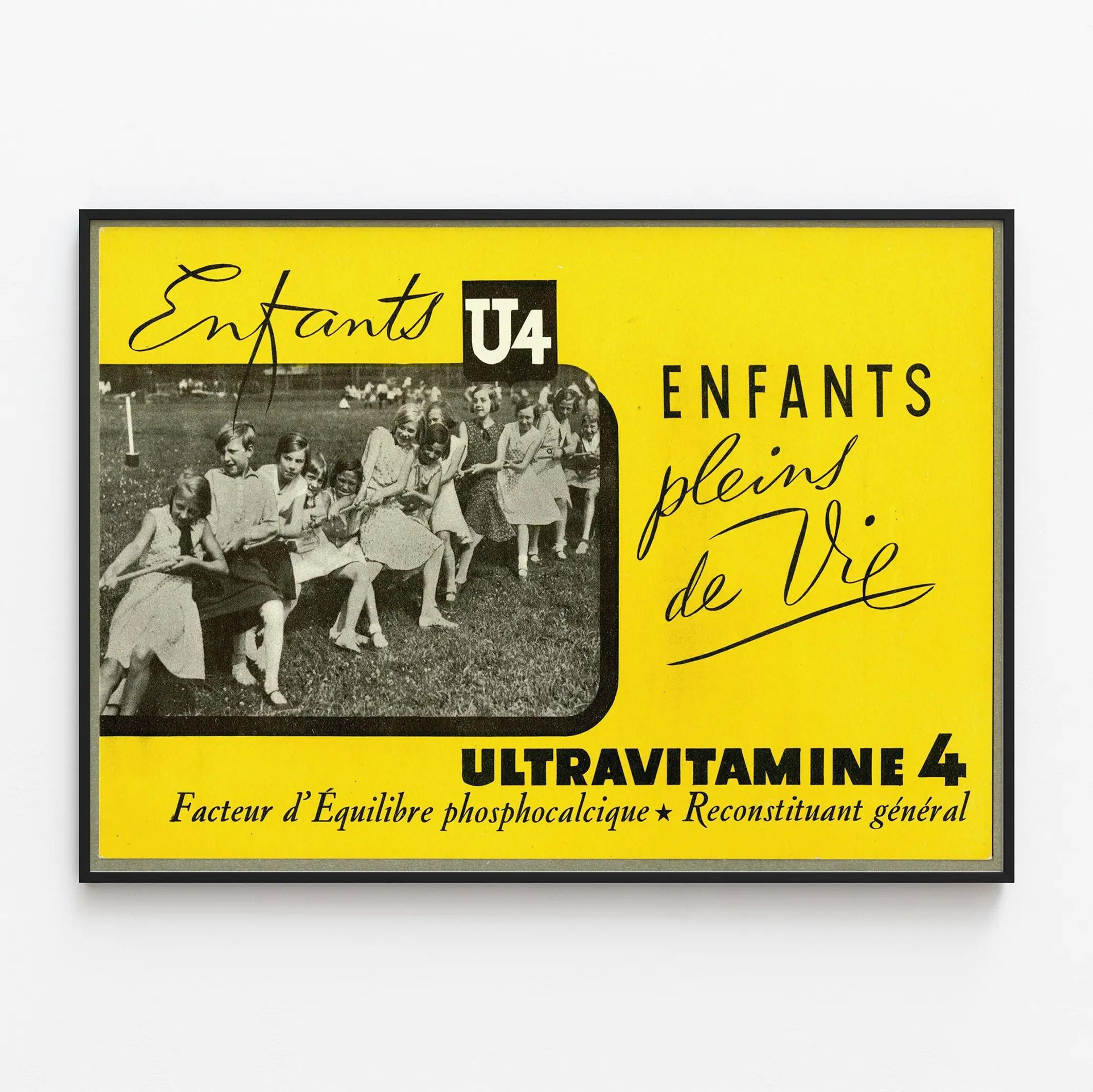 Den här vintageaffischen Ultraviamine 4 är ett unikt konstverk för väggdekoration som tillför en äkthetskänsla och retrocharm till ditt hem. På en strålande gul bakgrund skildrar postern ett svartvitt fotografi av barn mitt i en gemensam lek, som symboliserar glädje och livskraft. Meddelandet "Barn fulla av liv" skrivet i elegant handstil väcker tankar om hälsa och styrka, förstärkt av nämnandet "Ultraviamine 4", vilket antyder en vitaminprodukt för att stödja fosfor-kalciumbalansen och allmän återhämtning. Denna väggbild är perfekt för att dekorera ett barnsrum, ett lekrum eller ett familjerum, och skapar en varm och välkomnande atmosfär. Vintageaffischen Ultraviamine 4 utmärker sig med sina kontrasterande färger och sin grafiska stil som är typisk för gamla reklambroschyrer, vilket kommer att tilltala fans av originell väggdekoration. Genom att integrera denna poster i din inredning skapar du en dynamisk atmosfär fylld av minnen, samtidigt som du lyfter fram en retroestetik som passar lika bra i moderna som i mer klassiska interiörer. Denna dekorativa väggprydnad kan också vara en intressant presentidé för dem som uppskattar vintage design och historiska reklamaffischer.