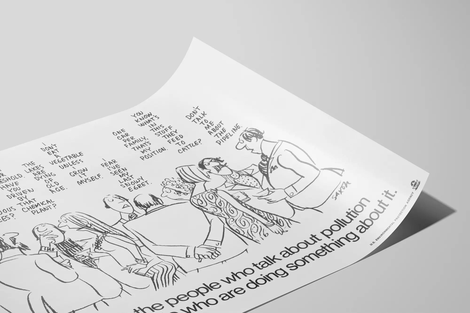 Den här vintageaffischen som väcker medvetenhet om föroreningar från U.S. Environmental Protection Agency är ett utmärkt väggdekoration för den som vill kombinera miljöengagemang med retrostil. Den svartvita designen visar en grupp karaktärer tecknade i seriefigurstil, som diskuterar och funderar över olika aspekter av förorening och miljö, såsom katalysatorer, lövfällande träd, kemiska fabriker, luft- och vattenkvalitet eller jordbruksmetoder. Denna affisch uppmanar till handling med ett tydligt och engagerat budskap längst ner: "Det är dags för de som pratar om förorening att gå från ord till handling.", vilket understryker brådskan att agera konkret mot föroreningar. Denna väggdekoration är perfekt för ett kontor, ett mötesrum eller ett utrymme för miljömedvetenhet. Den ger en samtidigt pedagogisk och estetisk touch tack vare sin enkla och uttrycksfulla teckning, samtidigt som den förmedlar ett starkt budskap om vikten av kollektivt ansvar. Denna pappersväggbild, med sin minimalistiska grafik och engagerade innehåll, passar perfekt för entusiaster av tematiska affischer och naturvårdare som vill dekorera sina väggar med bilder som bär på mening.