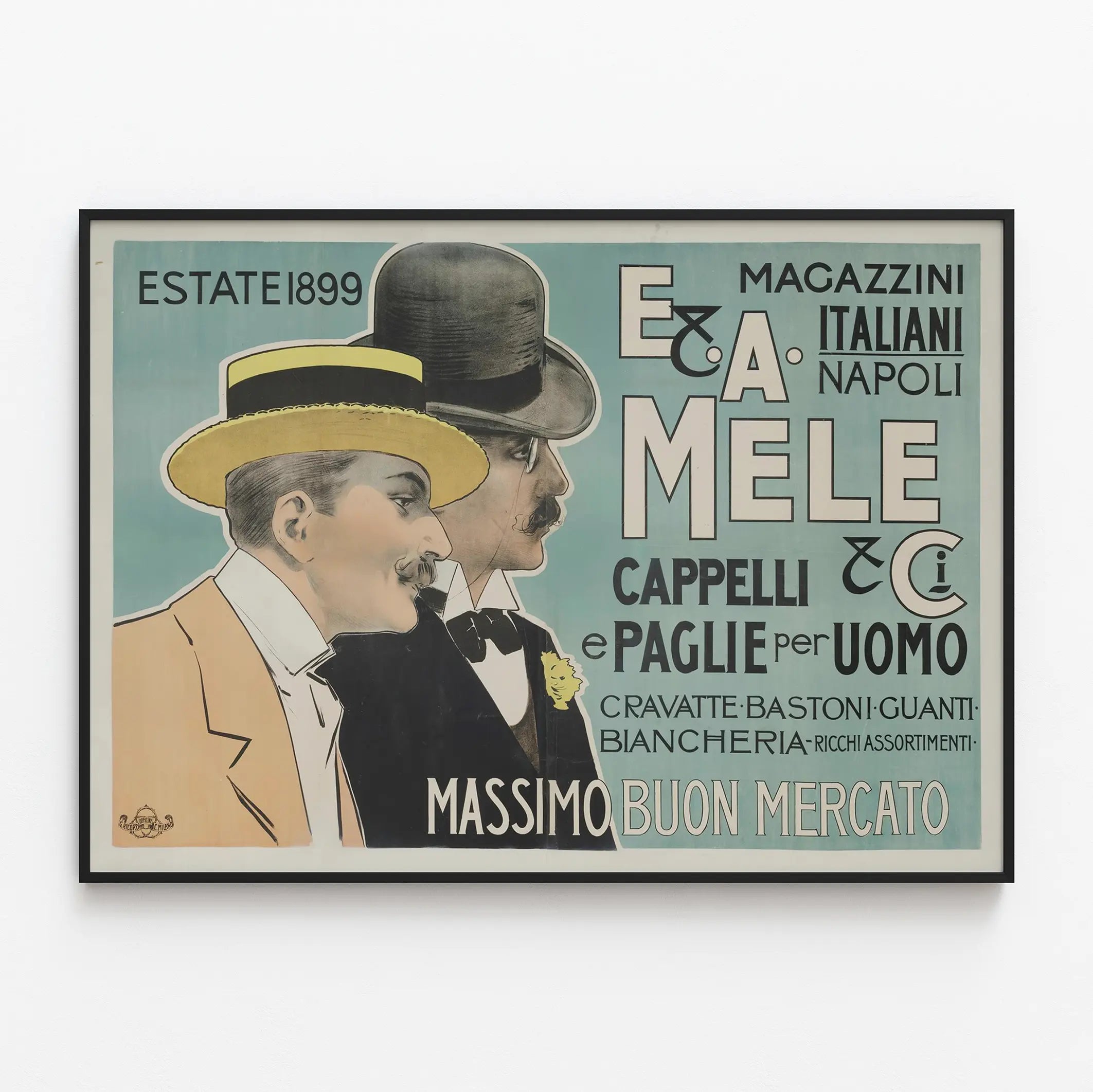 Denna italienska vintageaffisch föreställer en elegant reklam för Magazzini Italiani i Neapel, daterad till sommaren 1899. Med sin typiska grafiska stil från slutet av 1800-talet visar denna reklamposter två män iklädda hattar och stilfulla kläder från tiden, vilket speglar den förfinade manliga modetrenden. Kompositionen utmärker sig genom en mjuk blå bakgrund som kontrasterar mot silhuetter och text i svart och vitt, vilket skapar en visuellt effektfull bild som är både retro och sofistikerad.