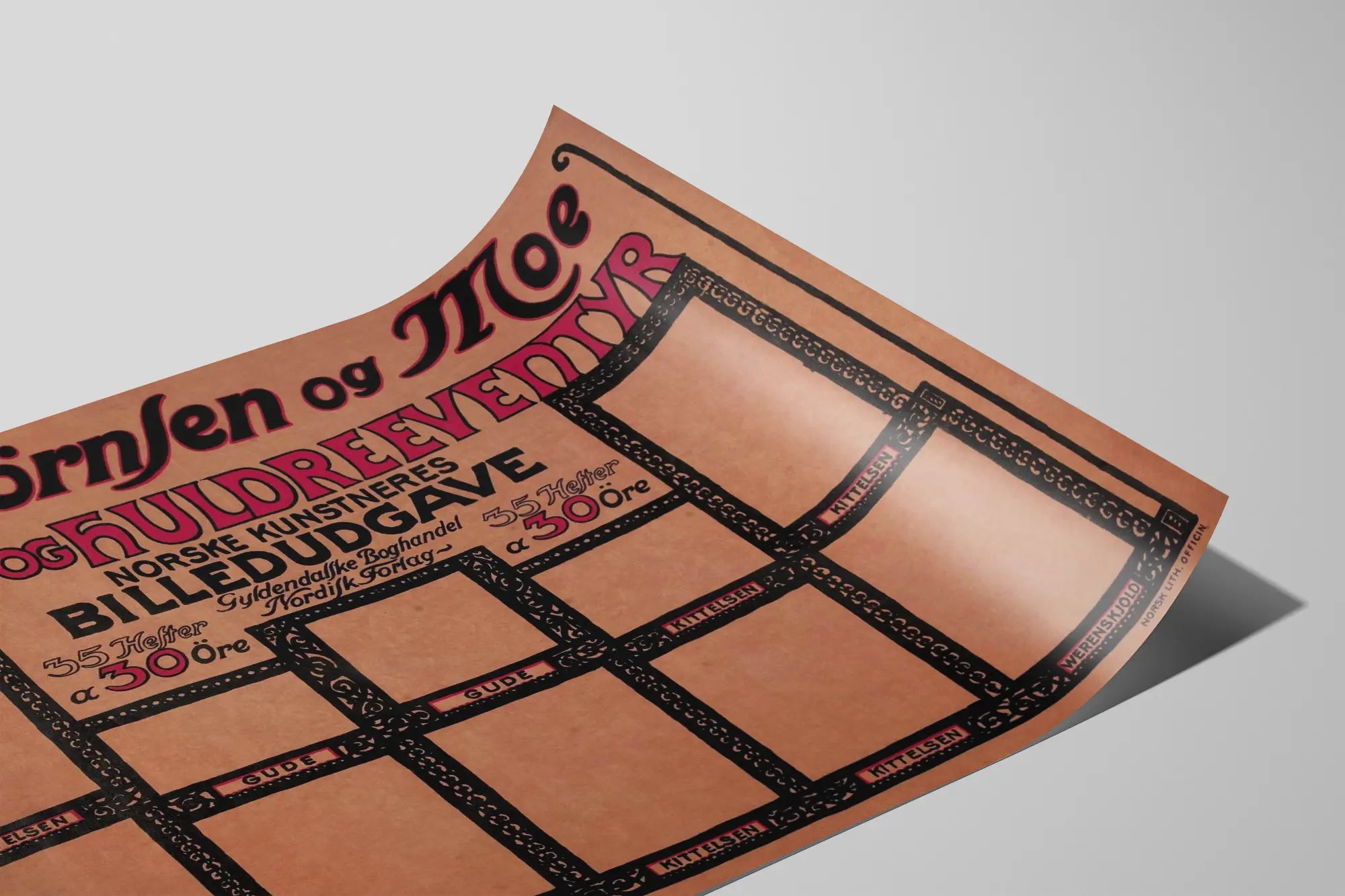 Den här vintageaffischen från Norge, « Asbjörnsen og Moe Folke- och Huldreeventyr », är ett vackert exempel på typografisk och grafisk konst avsedd att marknadsföra ett litterärt verk. Denna poster lyfter fram ett populärt norskt verk som samlar folksagor och legender från den traditionella folklore. Affischens komposition bygger på en teckning i svart och rött, med en mycket tydlig typografisk stil som omedelbart fångar uppmärksamheten.