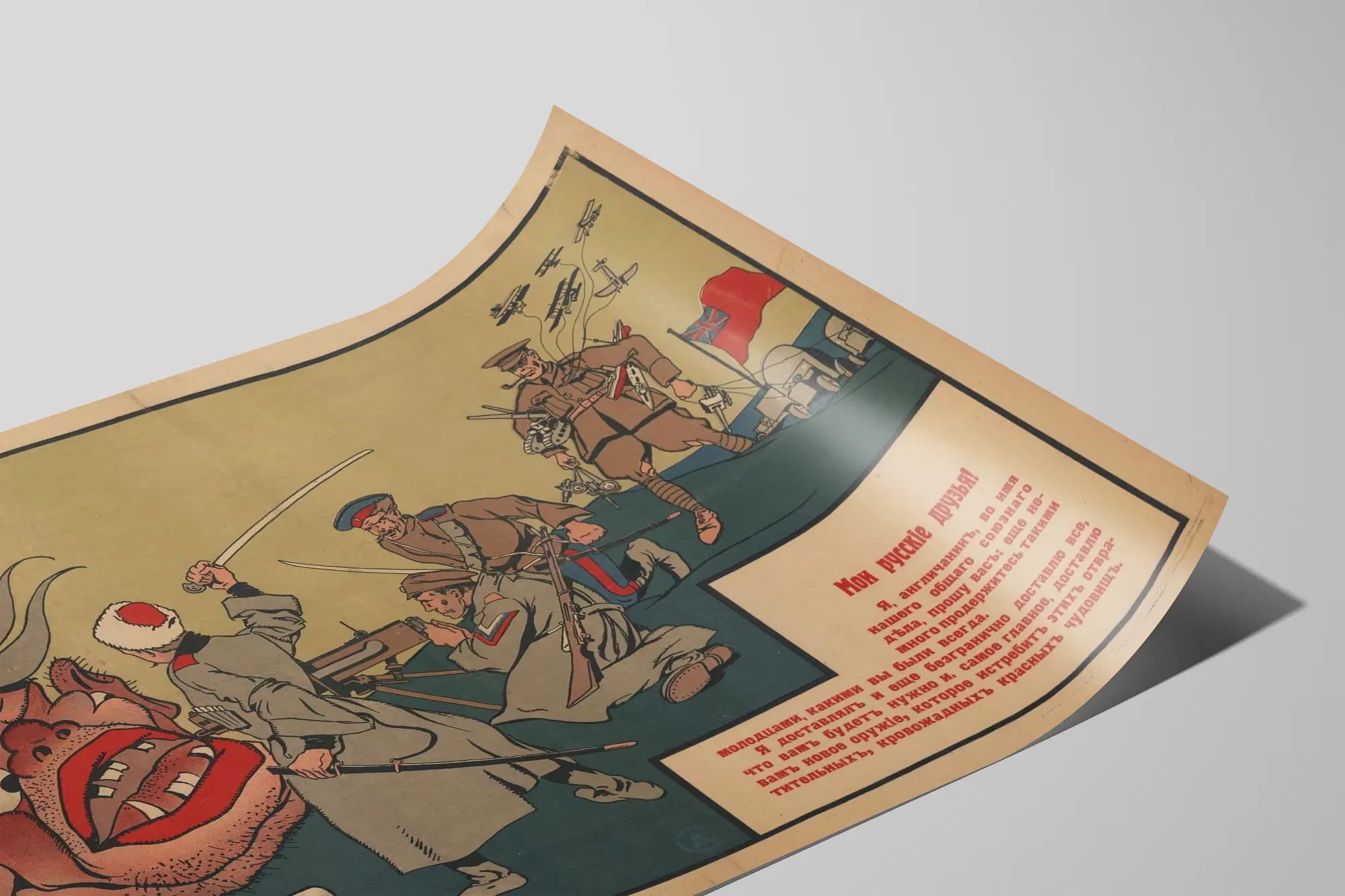 Denna vintageaffisch med sovjetiskt tema, kallad « Mina Ryska Vänner », är ett anmärkningsvärt väggdekorationselement, perfekt för historieälskare och retrodesignentusiaster. Denna poster, med tydlig grafisk stil och gammal estetik, skildrar en stridsscen där soldater, beväpnade med gevär och sablar, möter ett symboliskt rött monster, vilket antyder en historisk kontext kopplad till väpnade konflikter och motstånd. Bilden framhäver en dynamisk stridssituation med en komposition som omedelbart drar ögat mot den centrala handlingen. Kontrasten mellan de röda färgerna och de mer neutrala tonerna skapar en kraftfull och dramatisk atmosfär, vilket förstärker den dekorativa effekten av denna affisch. Den kyrilliska inskriptionen, integrerad i den högra delen av bilden, tillför ytterligare äkthet och ger en narrativ dimension till detta väggmålning, och väcker ett budskap om broderskap och stöd mellan allierade. Denna poster är perfekt för ett djärvt väggdekoration i ett vardagsrum, ett kontor eller ett arbetsutrymme, och ger en historisk touch till ditt hem. Genom att visa denna konstnärliga bit väljer du ett unikt dekorationsobjekt som kombinerar konst och historia, samtidigt som du berikar din samling av väggaffischer med ett originellt och meningsfullt verk. Den är lämplig att rama in eller använda som den är som en dekorativ detalj, och denna vintagebild kommer att dra till sig blickar och väcka nyfikenhet. Den riktar sig både till entusiaster av historiska affischer och till fans av originell och meningsfull väggdekoration.