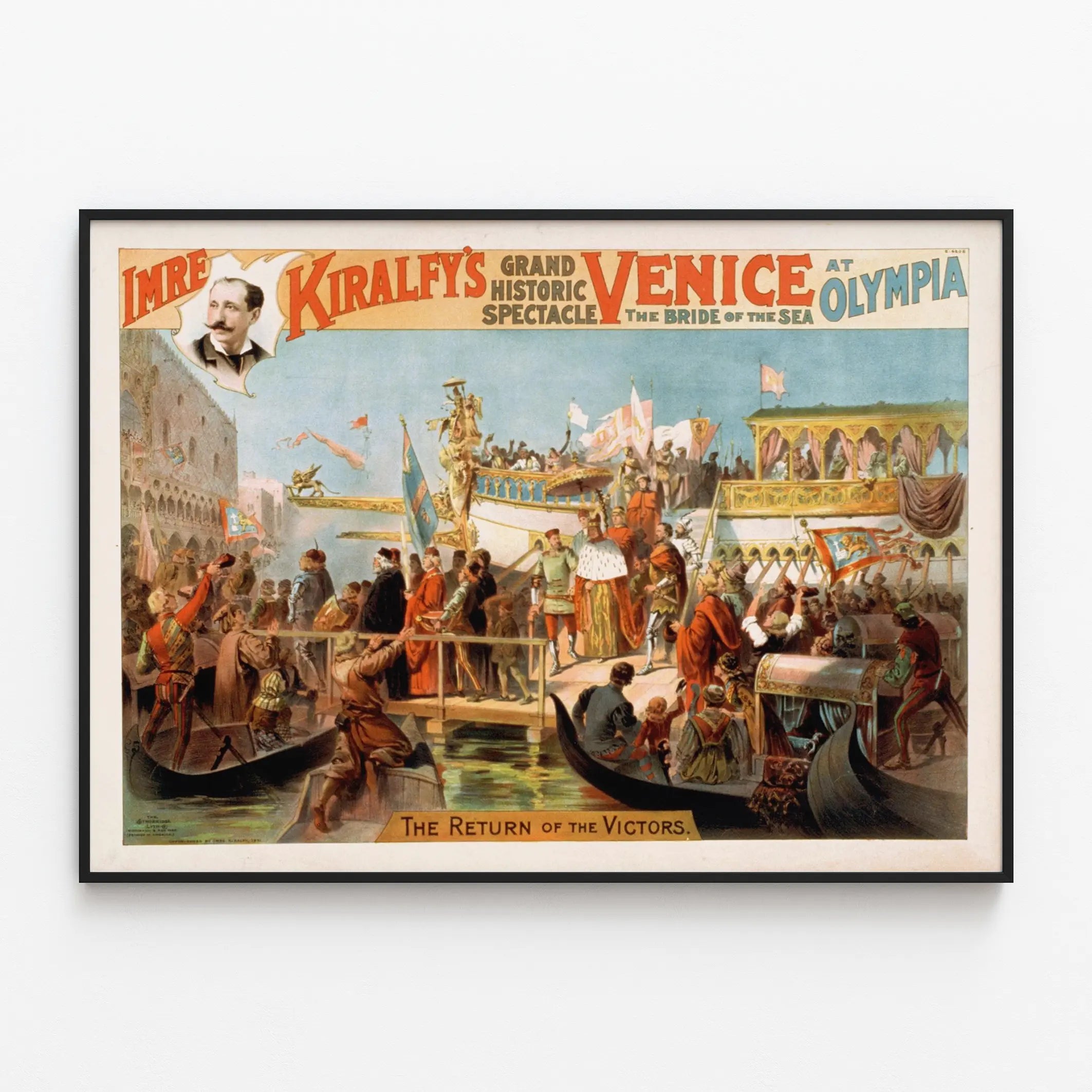 Upptäck detta vintageaffisch av ett stort historiskt spektakel med titeln «Venetian The Bride of the Sea at Olympia», som visar en triumferande återkomst på Venedigs kanaler. Detta färgglada affisch skildrar en scen rik på detaljer, med figurer i tidsenliga kostymer, prydda båtar och flytande flaggor, vilket skapar en festlig och majestätisk atmosfär. Perfekt för en väggdekoration med gammal inspiration, väcker detta konsttryck elegans och venetiansk kultur genom en noggrant utarbetad konstnärlig framställning. Detta väggtavla ger en touch av historia och äkthet till ditt hem, med sina klassiska nyanser och sin dynamiska komposition. Idealisk för konstälskare och entusiaster av kulturarvet, är detta vintageaffisch ett unikt föremål för att personifiera dina levnads- eller arbetsutrymmen.