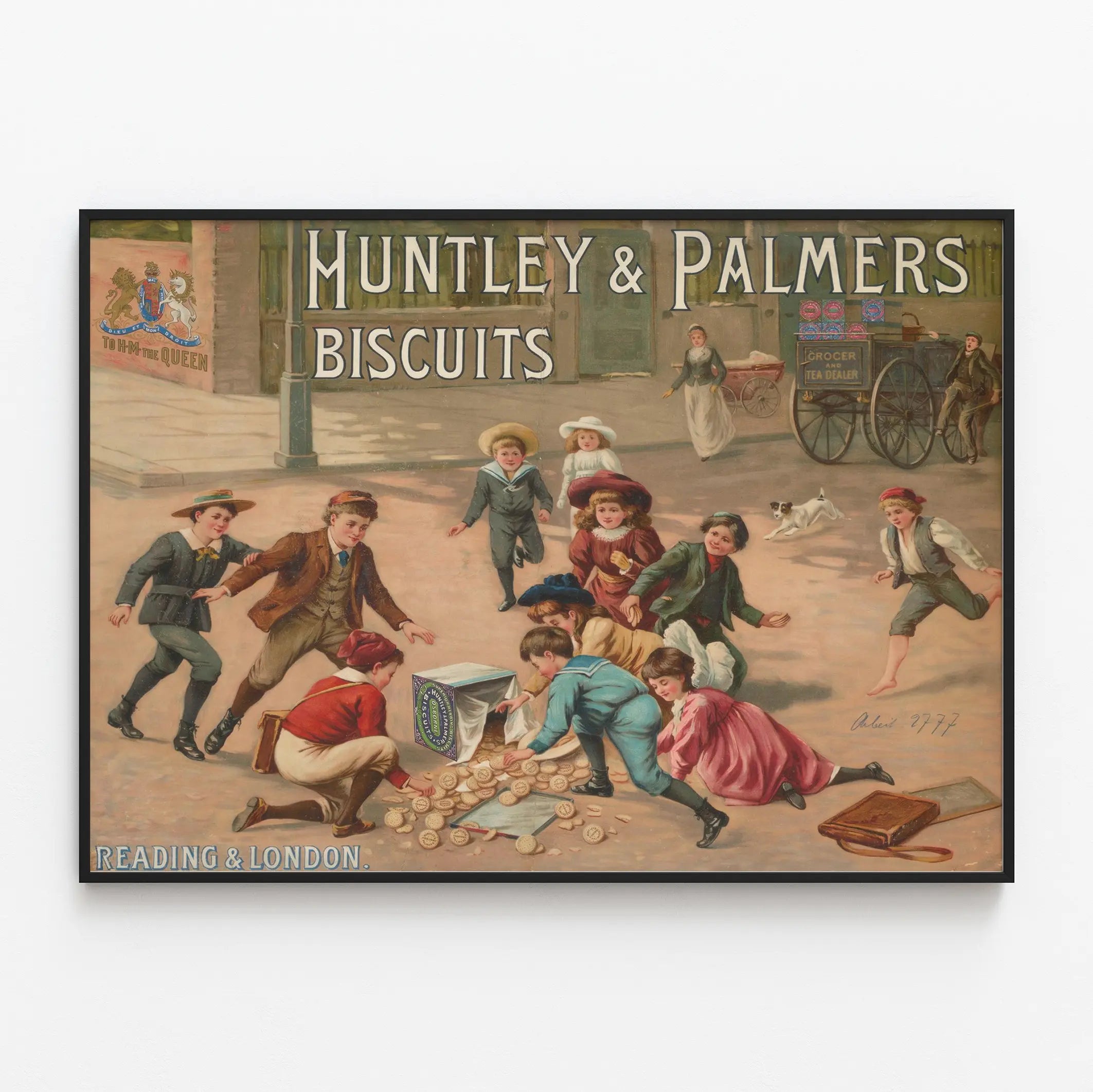 Den här vintageaffischen Huntley & Palmers Biscuits är ett perfekt väggdekoration för entusiaster av gammaldags och retroinspirerad inredning. Föreställande en livlig scen där barn leker runt en vältad kakask box, framkallar denna affisch en glad och nostalgisk atmosfär. Barnen, klädda i typiska tidsenliga dräkter, är fascinerade av kakorna som sprider sig på golvet, vilket ger verket en livfull och dynamisk känsla. I bakgrunden syns en vagn för gatuförsäljare med inskriptionen "GROCER AND TEA DEALER", vilket tillför en historisk kontext till denna vintageannons. Affischen visar också ett kungligt emblem med inskriptionen "TO H.M. THE QUEEN", vilket vittnar om officiell erkänsla och förstärker den autentiska och prestigefyllda karaktären av motivet. Den stora texten högst upp, "HUNTLEY & PALMERS BISCUITS", dominerar kompositionen och riktar omedelbart blickarna mot märket samtidigt som den betonar det reklammässiga syftet. Nederst på affischen nämns städerna "READING & LONDON", vilket påminner om det brittiska ursprunget för detta ikoniska företag. Denna väggdekoration är idealisk för att tillföra en känsla av äkthet och nostalgi till ett kök, vardagsrum eller ett vintagebutiksutrymme. Med sina mjuka färger och illustrativa stil illustrerar denna poster perfekt estetik av reklamaffischer från början av 1900-talet. För samlare eller entusiaster av tematisk väggdekor utgör denna Huntley & Palmers Biscuits-affisch ett uttrycksfullt dekorativt val, som förenar historia och grafisk konst i en varm och vänlig atmosfär.
