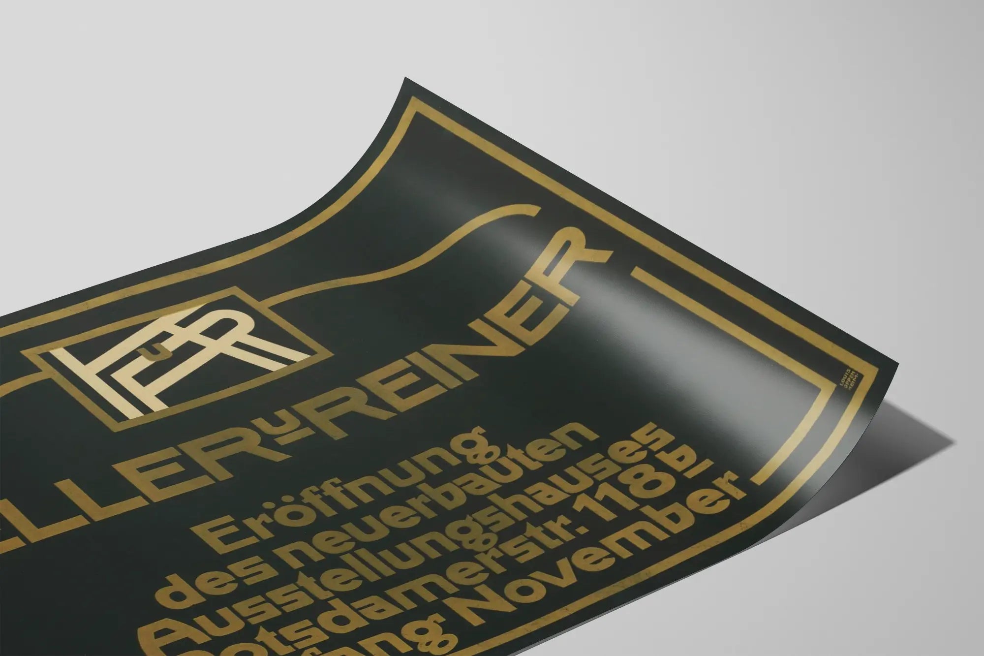 Denna affisch från Keller und Reiner är ett väggdekorationselement i vintage och minimalistisk design, perfekt för konstälskare och typografientusiaster. Denna poster visar en intensiv svart bakgrund förhöjd av ett grafiskt guldstreck som omedelbart fångar uppmärksamheten. Den annonserar öppningen av en ny utställningsbyggnad belägen på 118b Potsdamerstrasse, planerad till början av november. Dess stil kännetecknas av användning av enkla geometriska former och ett djärvt, regelbundet typsnitt, vilket ger en elegant och retro estetik som passar perfekt i ett modernt eller klassiskt inrett hem.