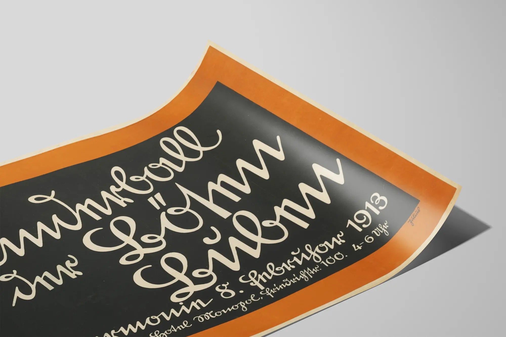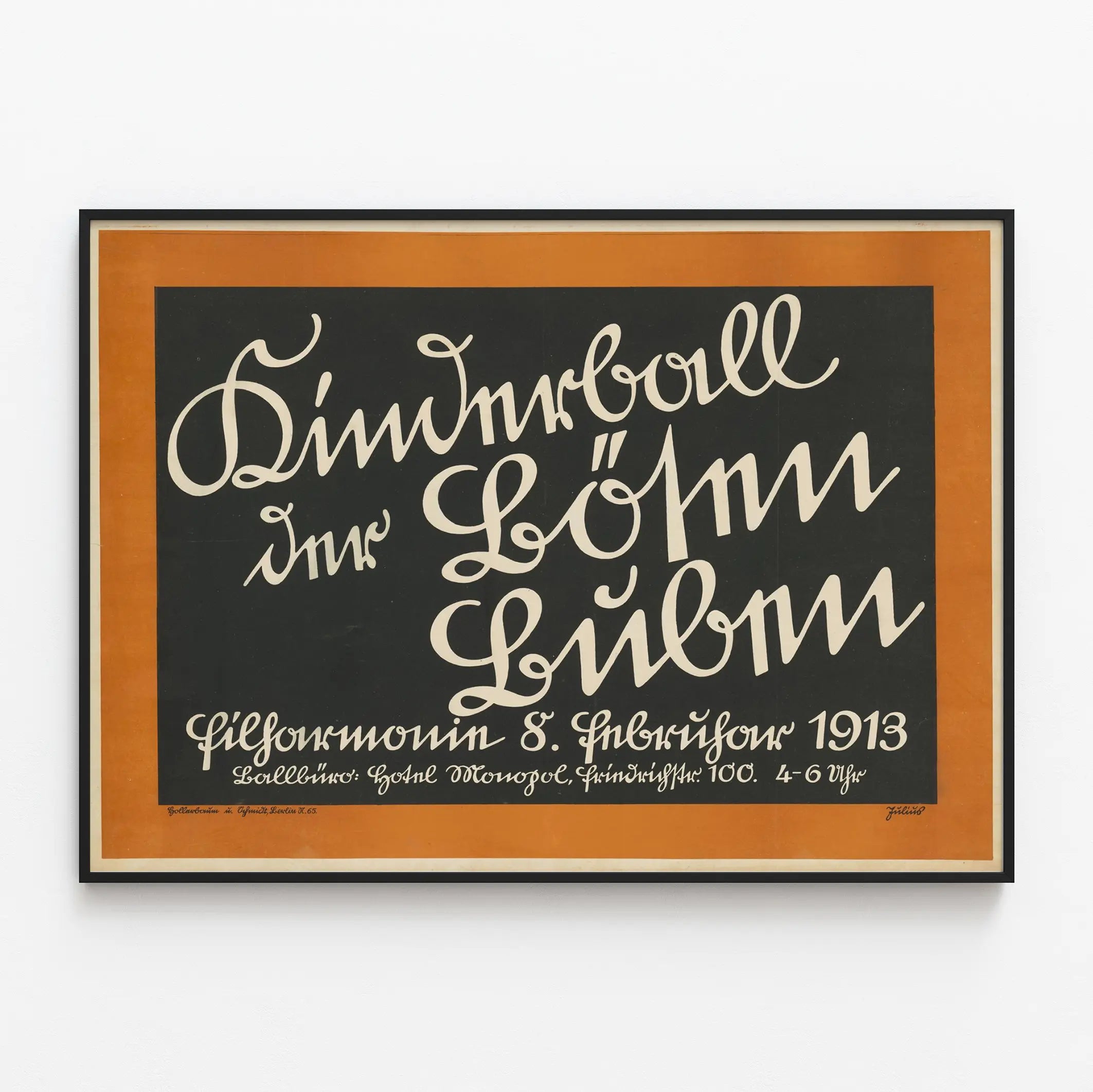 Denna vintageaffisch « Kinderball Der Bosen Buben » är ett unikt konstverk för alla väggdekorationer med retro- och grafisk stil. Datum från 1913, denna typografiska affisch i svartvitt på svart bakgrund, inramad av en ockerrand, ger en tydlig och äkta stil till ditt hem. Dess design består av elegant och originell kursiv skrift, vilket gör denna affisch till ett mycket eftertraktat dekorativt inslag för entusiaster av grafisk konst och historiska affischer. Den passar perfekt som väggdekoration i ett vardagsrum, ett bibliotek eller ett kreativt utrymme, och tillför en tidlös estetik och gammal charm. Denna dekorativa affisch är ett äkta vittnesmål om den tyska typografiska designen från början av 1900-talet, som förenar färgsymbolik med dynamiska kalligrafiska former. Oavsett om den används för att pryda en modern vit vägg eller skapa en vintageatmosfär, passar denna affisch lätt in i olika inredningsstilar. Idealiskt som inramad poster, den visar grafiken från tiden i all sin rikedom och bidrar till att skapa en unik och förfinad atmosfär i rummet. Genom att välja denna väggdekoration, väljer du ett föremål med historia som fångar blickar med sin originalitet och omsorgsfulla komposition.