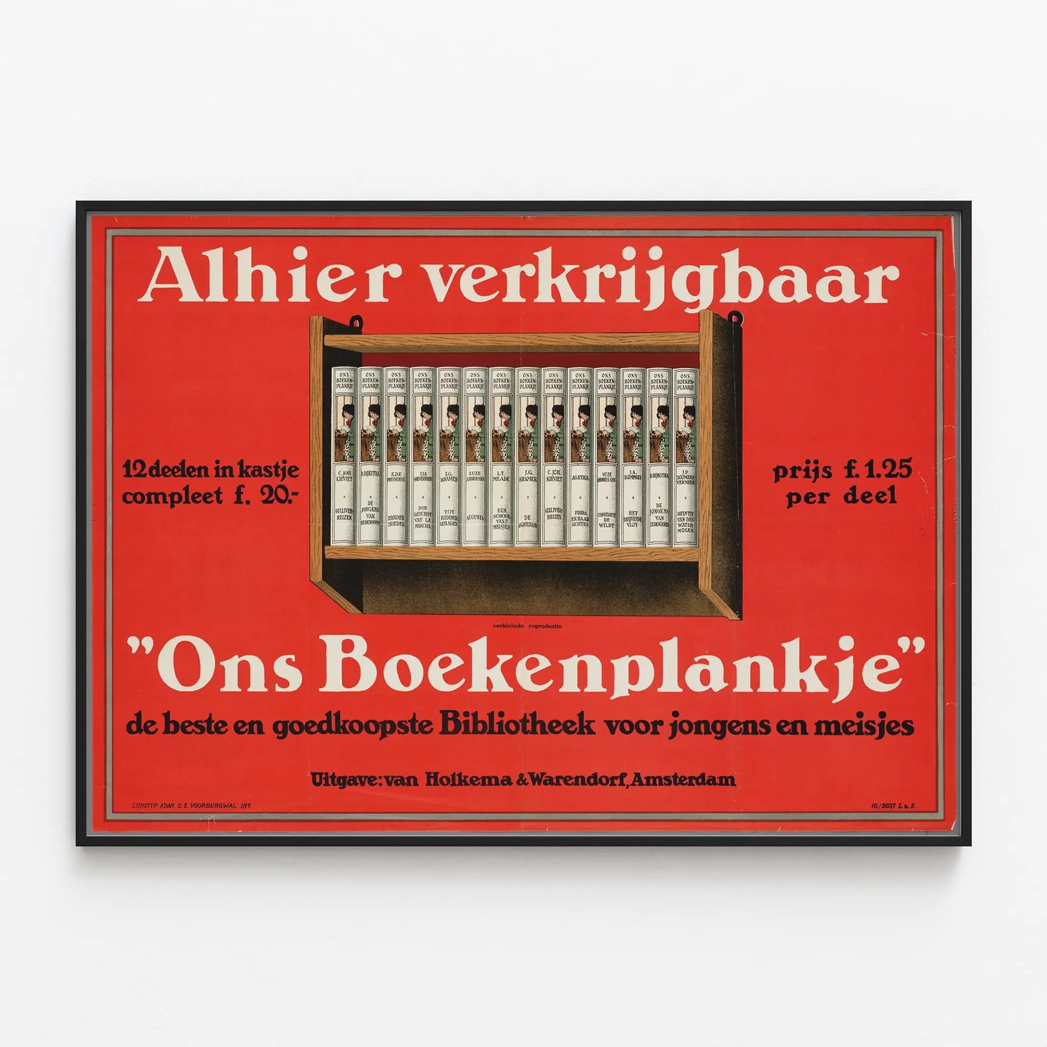 Upptäck denna vintageaffisch "Ons Boekenplankje", ett unikt väggdekorationselement som kommer att glädja litteraturälskare och retrodesignentusiaster. Denna affisch framhäver ett miniatyrbibliotek bestående av 12 noggrant placerade volymer i ett trähyllsystem, som enkelt och charmigt illustrerar en samling barnböcker. Den klara röda bakgrunden i kombination med kontrasterande typografiska teckensnitt i vitt och svart skapar ett starkt visuellt intryck, perfekt för att liva upp en vägg i vardagsrummet, kontoret eller biblioteket.