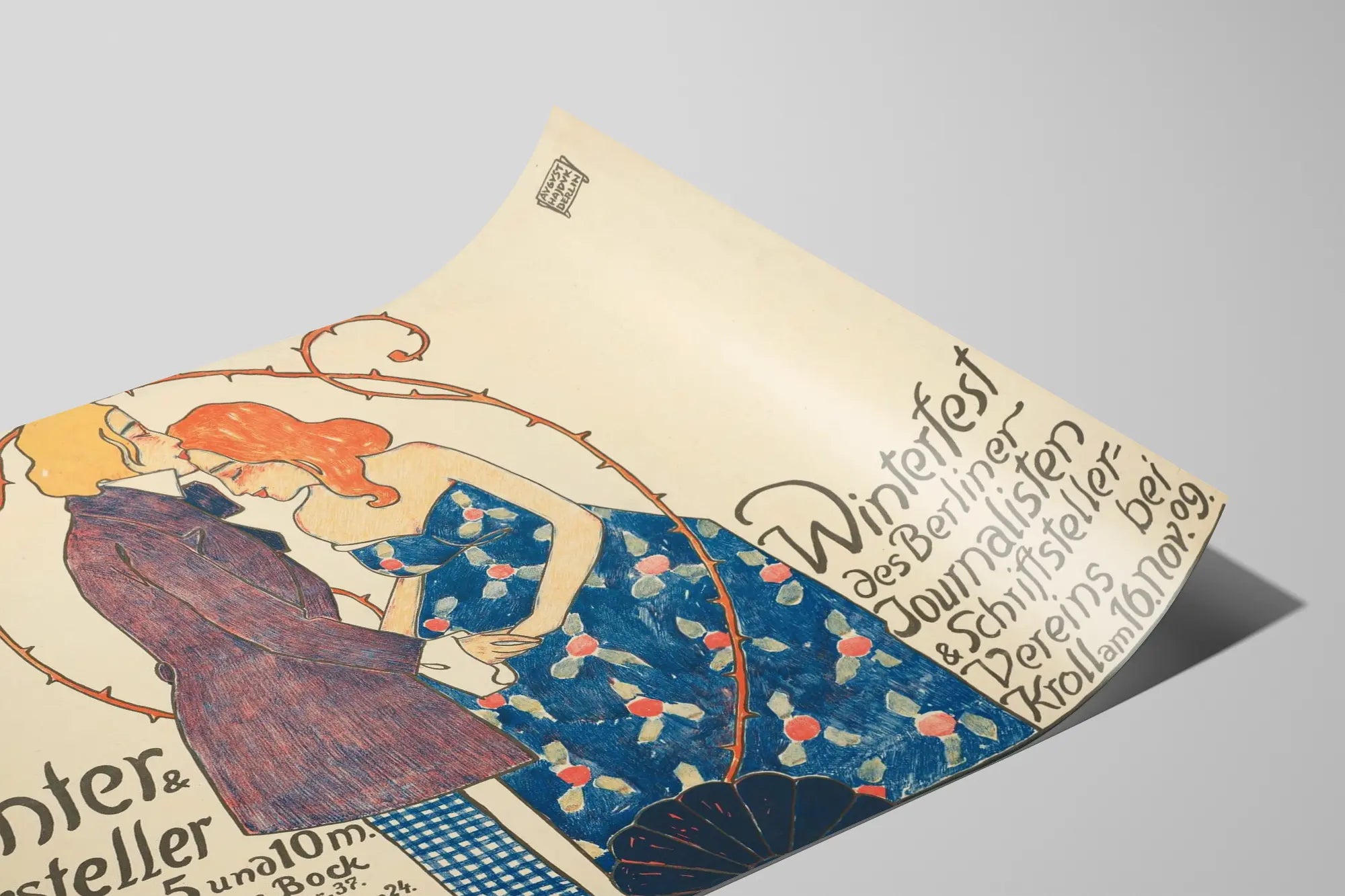 Upptäck denna vintageaffisch som föreställer en öm scen mellan en man och en kvinna i en grafisk, illustrativ och färgstark stil. Denna väggdekoration framkallar en retrocharm med sina dominerande färger blått, orange och beige, samt en teckning präglad av ett precist streck och blomsterdetaljer på kvinnans klänning. Affischen är ett visuellt vittnesmål om Winterfesten arrangerad av Berliner Journalisten & Skribentföreningen, ett stort kulturevenemang i Berlin som lyfter fram poeter och skådespelare. Dess delikata design och den mysiga atmosfär den utstrålar gör den till ett perfekt dekorativt föremål för en konstnärlig och sofistikerad atmosfär. Denna affisch passar utmärkt som väggdekoration i ett vardagsrum, ett bibliotek eller ett utrymme för litteratur och teater, och understryker en smak för gammal konst och nostalgiska stämningar. Dess eleganta typografi harmoniserar med illustrationen och förstärker dess unika karaktär som väggtavla. En elegant och historieberik poster som förhöjer ditt hem med äkthet och stil.