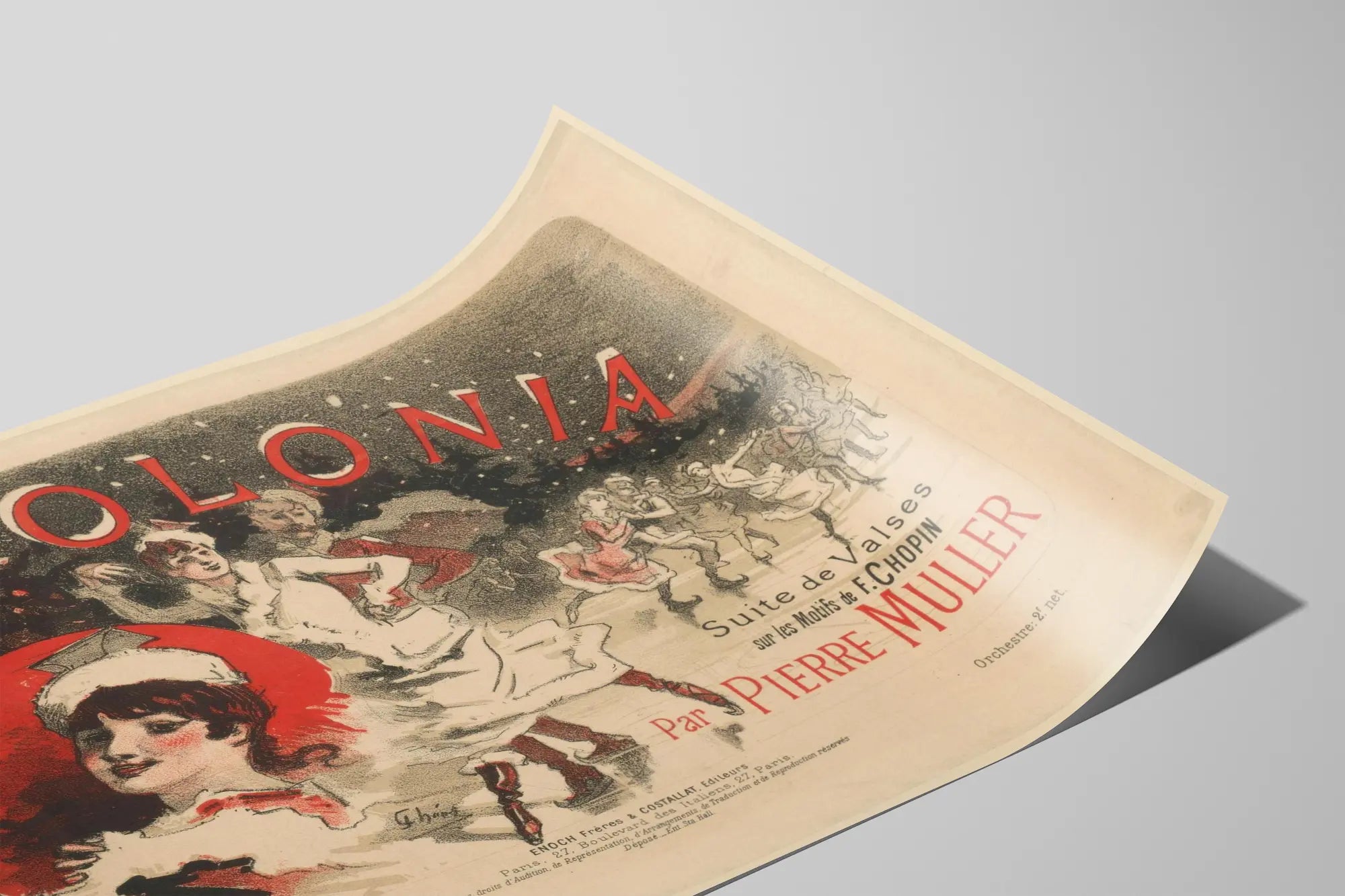 Denna vintageaffisch, med titeln "Polonia Suite de Valses sur les Motifs de F. Chopin par Pierre Muller", är ett unikt konstverk som tillför en touch av elegans och historia till din väggdekoration. Inspirerad av de berömda valsarna av kompositören Frédéric Chopin, skildrar denna affisch dansare i rörelse i en glad och festlig atmosfär, illustrerad i en retrostil med dominerande nyanser av rött, svart och beige. Den grafiska kompositionen blandar harmoniskt skisser och färgklickar, särskilt en livfull röd cirkel runt porträttet av en dansare i förgrunden, som omedelbart fångar blickfånget. Denna poster, som hämtar inspiration från den klassiska musikvärlden, är perfekt för att pryda en vägg med en känsla av sofistikering och kultur. Oavsett om du är musikälskare, dansentusiast eller bara söker ett unikt dekorativt inslag, kommer denna vintageaffisch att passa utmärkt i ett vardagsrum, ett kontor eller ett musikrum. Som väggdekoration inbjuder den till eftertanke samtidigt som den ger ett visuellt driv, inspirerat av dans och klassisk musik. Dess gamla typografi, som blandar rött och svart, förstärker dess charm från förr och dess äkthet. Välj denna affisch för att skapa en inredning som berättar en historia och ger liv åt elegansen i valsarna på motiv av Chopin, och tillför en konstnärlig och förfinad prägel till ditt hem.