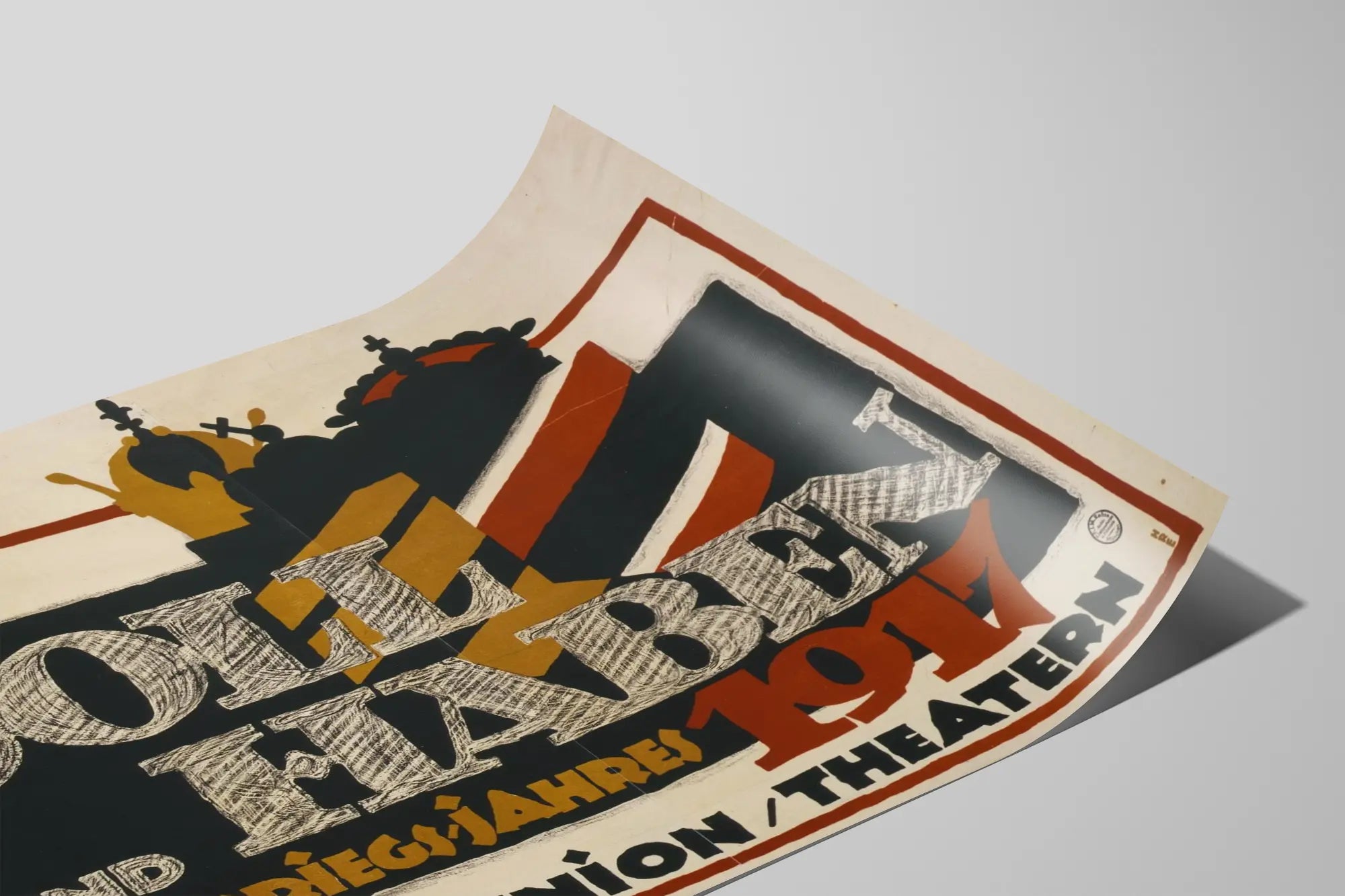 Denna vintageaffisch med titeln « Soll und Haben des Kriegsjahres 1917 » erbjuder ett unikt stycke för entusiaster av väggdekoration som är både historiska och grafiska. Denna poster, från 1917, visar en stark typografisk design med bokstäver som har tydliga texturer, blandande kontrasterande färger som svart, rött och guld. Kompositionen framhäver en central ram med titeln i imponerande versaler, understruken av grafiska detaljer, inklusive två stiliserade kronor placerade i övre delen som tillför en symbolisk och arkitektonisk touch till helheten. Den röda ramen runt affischen tydligt avgränsar uttryckszonen och förstärker det visuella intrycket av budskapet. Denna väggdekoration är perfekt för den som söker en konstnärlig prägel som väcker historia från början av 1900-talet, särskilt inom teater och världskonflikter från 1917. Oavsett om det är affisch eller poster, passar den naturligt i ett vardagsrum, ett kontor eller ett kulturutrymme, och ger en vintagekänsla som påminner om en tid präglad av stora historiska händelser. Dess tunga typografi och stiliserade grafik gör den också till ett utmärkt val för samlare och entusiaster av gammal visuell kommunikation. Denna väggbild ger en visuell äkthet som berikar varje interiör med karaktär och historia. Genom att använda denna affisch som väggdekoration väljer du en atmosfär som är både retro och kulturell, nära teaterns värld och det historiska minnet. Den fungerar också som en utgångspunkt för många diskussioner om den visuella och politiska påverkan av denna typ av kommunikation under Första världskriget. Denna tidsenliga poster är således ett utmärkt inredningsval för att skapa en atmosfär som är både vintage och engagerad, vilket tilltalar en publik som är känslig för gamla grafiska konstformer och deras berättande kraft.