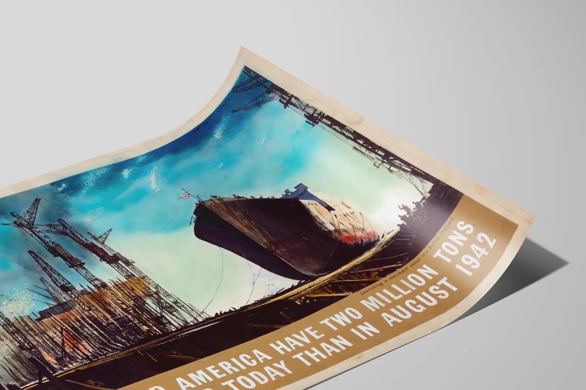 Denna vintageaffisch illustrerar Storbritanniens och Amerikas ökade maritima styrka, med en betydande ökning av sjötransportkapaciteten, två miljoner ton mer jämfört med augusti 1942. Föreställande ett handelsfartyg som sjösätts i en brittisk varv, fångar denna väggdekoration den industriella atmosfären och den dynamiska produktionen av fartyg under en avgörande period. Med sina intensiva färger och tydliga grafiska stil är denna affisch ett unikt föremål, perfekt för entusiaster av historia, marint och retrodesign. Den passar utmärkt som tavla eller poster i ett hem eller kontor som söker en historisk och äkta touch. Oavsett om den placeras i ett vardagsrum, ett arbetsrum eller ett bibliotek, tillför den en maritim atmosfär och en kraftfull visuell berättelse kring transport och industriell ansträngning. Detta konstverk främjar en originell väggdekoration, som kombinerar en konstnärlig stil från mitten av 1900-talet med ett starkt historiskt budskap, symboliserande den logistiska kapacitetens tillväxt under andra världskriget. Denna poster är också en utmärkt idé för att personifiera ett utrymme dedikerat till maritim passion eller vintage industriell inredning.