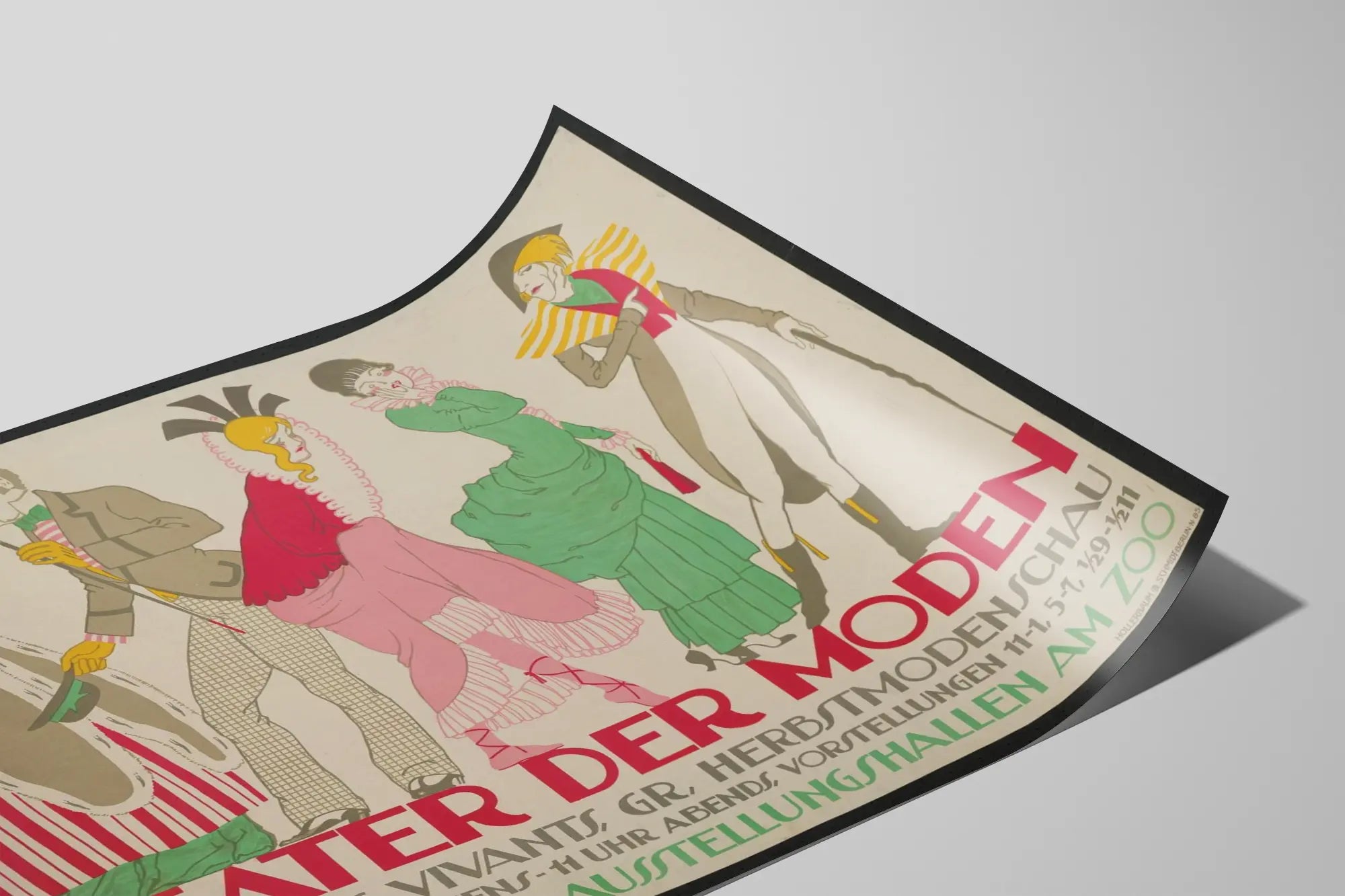Denna vintageaffisch "Theater der Moden" från 1913 är ett ikoniskt väggdekorationselement som kombinerar elegans och teater- samt modehistoria. Med sina kostymklädda figurer med överdrivna och färgstarka silhuetter erbjuder denna affisch en unik konstnärlig framställning som väcker minnen från de tidiga decennierna av 1900-talet. Den illustrerar en teaterscen där levande modeller visar höstens modetrender i en teatralisk framställning. Grafiken utmärker sig genom flytande linjer, klara och kontrasterande färger samt en typografisk stil från epoken som understryker äktheten i detta verk. Denna poster ger en retro-chic touch till alla interiörer, oavsett om det är ett vardagsrum, ett kontor eller ett väntrum. Användningen av visuella element kopplade till teater och mode gör den också till ett perfekt val för kulturentusiaster eller yrkesverksamma inom branschen som vill kombinera estetik och historia. Denna väggdekoration är idealisk för att tillföra ett konstnärligt accent till en neutral vägg, och ger liv och historisk charm till rummet. Tack vare sina generösa mått fångar den omedelbart uppmärksamheten samtidigt som den berättar en rik visuell historia. Som affisch passar den utmärkt för att framhävas i ram, vilket framhäver de fina detaljerna och de distinkta färgerna. Denna vintageaffisch "Theater der Moden" är ett utmärkt val för den som söker en originell väggdekoration, präglad av historia och förfining, som väcker teaterkonstens och modets minnen från en svunnen tid.