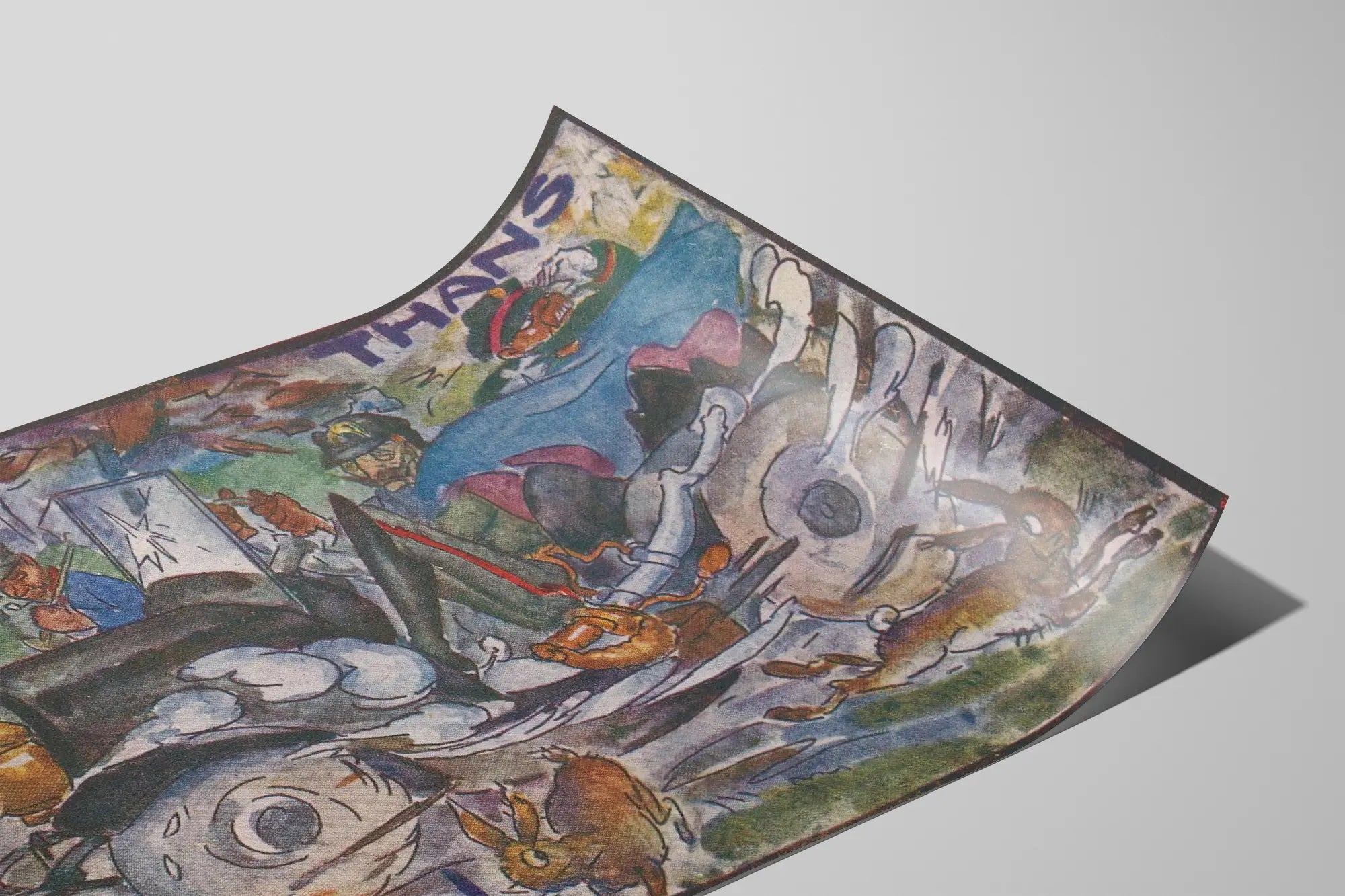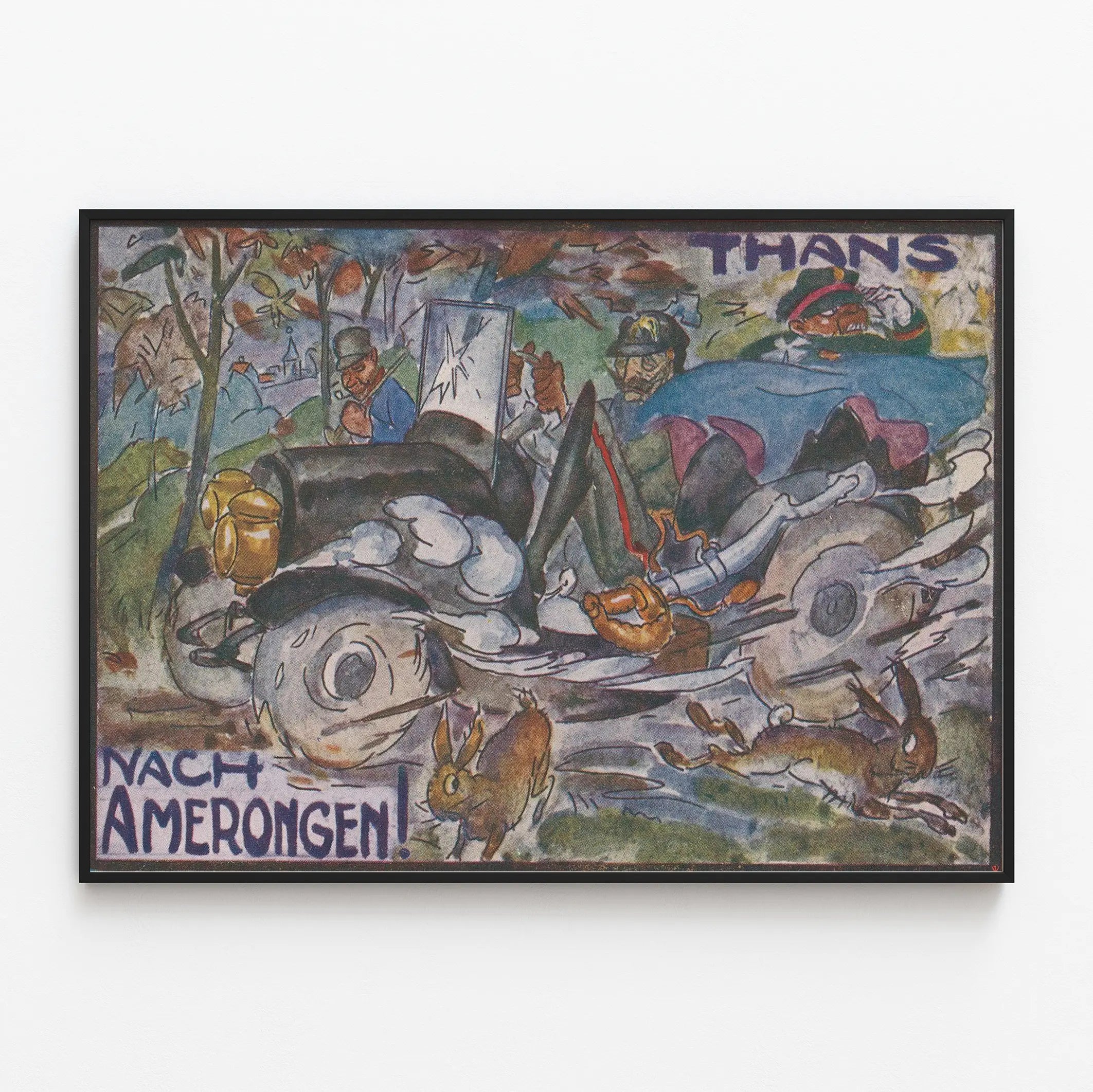 Den här vintageaffischen med titeln "Thans Nach Amerongen" skildrar en dynamisk och full av rörelse scen med en gammal militärbil med flera soldater ombord. Bilden är rik på livfulla färger och stiliserade detaljer, med en konstnärlig stil som blandar realism och karikatyr. Bilen verkar färdas i full fart, med hjul tecknade nästan abstrakt, och flera kaniner som hoppar över vägen tillför en känsla av liv och natur till scenen. Soldaterna, igenkännbara på sina uniformer och hjälmar, som skapar en atmosfär av tidsepok, förstärker den historiska eller militära karaktären av detta verk. Bakgrunden visar skissartade naturliga och arkitektoniska element, inklusive träd och silhuetter av byggnader, vilket ger djup till kompositionen. Denna affisch är ett utmärkt förslag för en originell väggdekoration, perfekt för entusiaster av retrokonst, militärhistoria eller illustrationer i ett uttrycksfullt och färgstarkt stil. Oavsett om den placeras i ett vardagsrum, ett kontor eller ett rum för samling av affischer, tillför detta väggmålning en unik och energifylld atmosfär. Dess konstnärliga uttryck och berättande detaljer gör denna affisch till ett dekorativt inslag som är både estetiskt tilltalande och väckande, och som kan väcka nyfikenhet och samtal. Perfekt för att berika ett hem med en retro konstnärlig touch, passar denna väggdekoration in i eklektiska och vintage stilar, och tillför kontrast och dynamik till dina väggar.