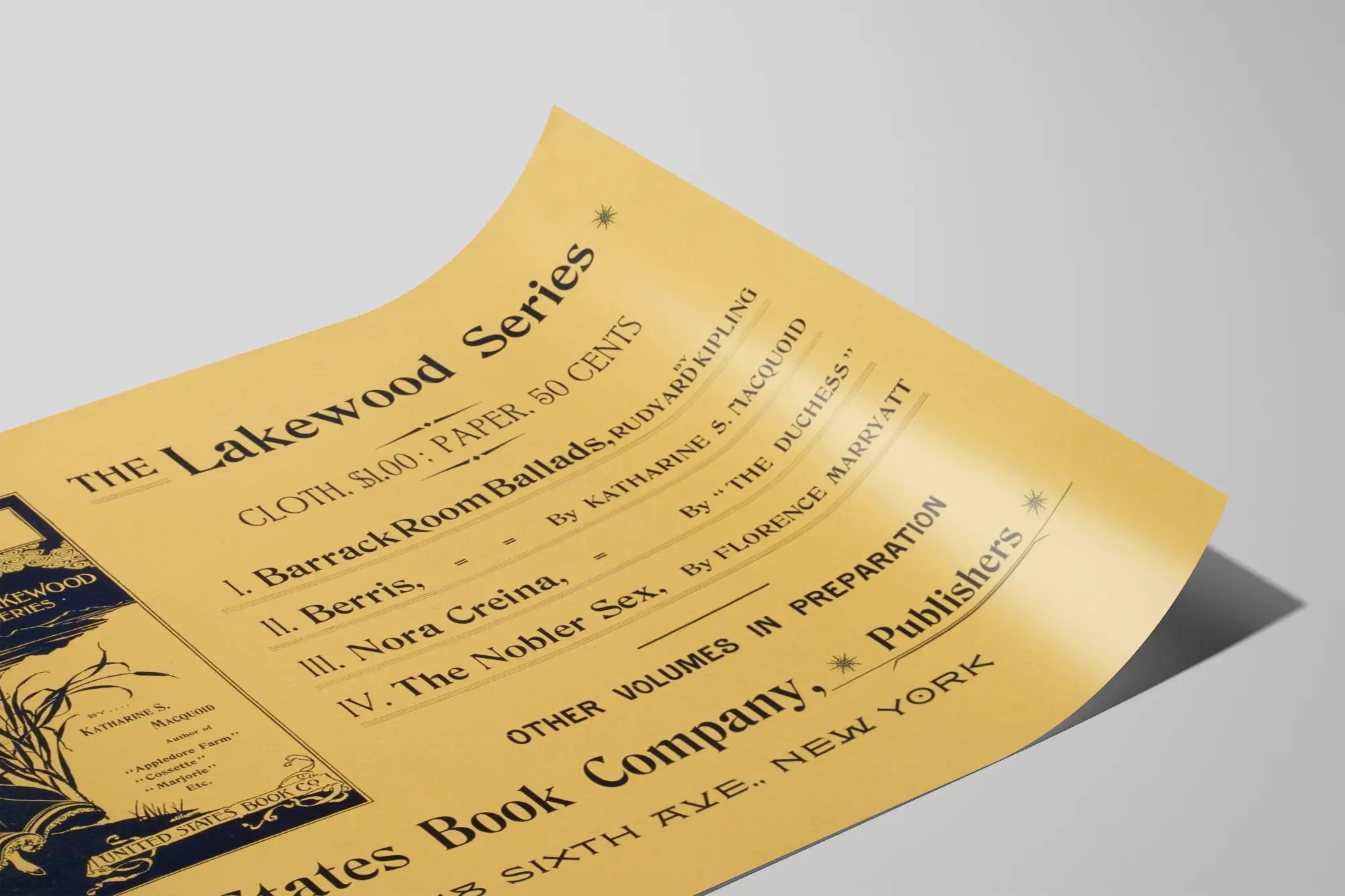 Denna affisch erbjuder en harmonisk balans mellan text och bild, med en klassisk typografi som lyfter fram titlarna på verken i Lakewood Series: "Barrack Room Ballads" av Rudyard Kipling, "Berris" av Katharine S. Macquoid, "Nora Creina" signerad "The Duchess" och "The Nobler Sex" av Florence Marryatt. En vacker inbjudan till gammal litteratur och kultur, som med fin elegans illustrerar en reklambild från tiden.