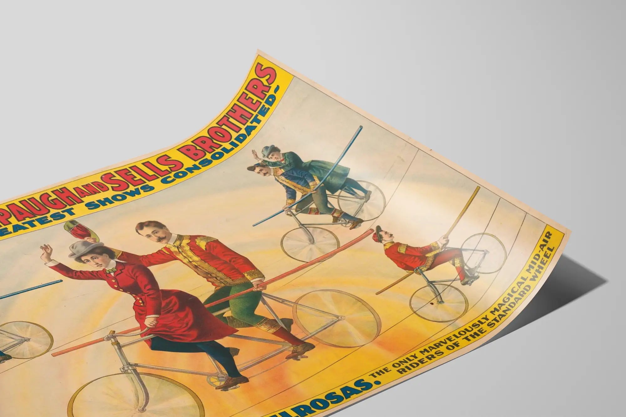 Fördjupa dig i den unika atmosfären av det gamla scenkonstlivet med denna vintageaffisch som föreställer The Miraculous Melrosas, berömda cirkusartister från Adam Forepaugh och Sells Brothers. Den färgglada postern illustrerar akrobater i tidsenliga kostymer som utför cykelkonster på en lina, i en livfull scen med nyanser av rött, gult och blått. En originell väggdekoration, perfekt för entusiaster av retroföreställningar eller samlare av grafiska konstobjekt kopplade till cirkus och scenkonst. Denna dekorativa tavla framhäver en äkta vintagestil, med slående typografi och en dynamisk komposition som omedelbart fångar blickar. Perfekt affisch för att personifiera ett inomhusutrymme med en touch av historia och gammal charm. Denna unika pjäs tillför en varm och retro atmosfär till vilket rum som helst, och förenar den historiska grafiska estetikens skönhet med passionen för de akrobatiska framträdandena från förr. En dekorationspresentidé för samlare eller för den som vill lyfta fram sitt hem med ett originellt och berättelsefyllt dekorationsobjekt. Denna vintageväggaffisch passar perfekt i ett vardagsrum, ett kontor eller ett lekrum, och tillför färg och originalitet till väggarna. Med sina noggrant utarbetade detaljer och uttrycksfulla figurer är den en levande hyllning till de rörliga föreställningarna och populärunderhållningen från början av 1900-talet.