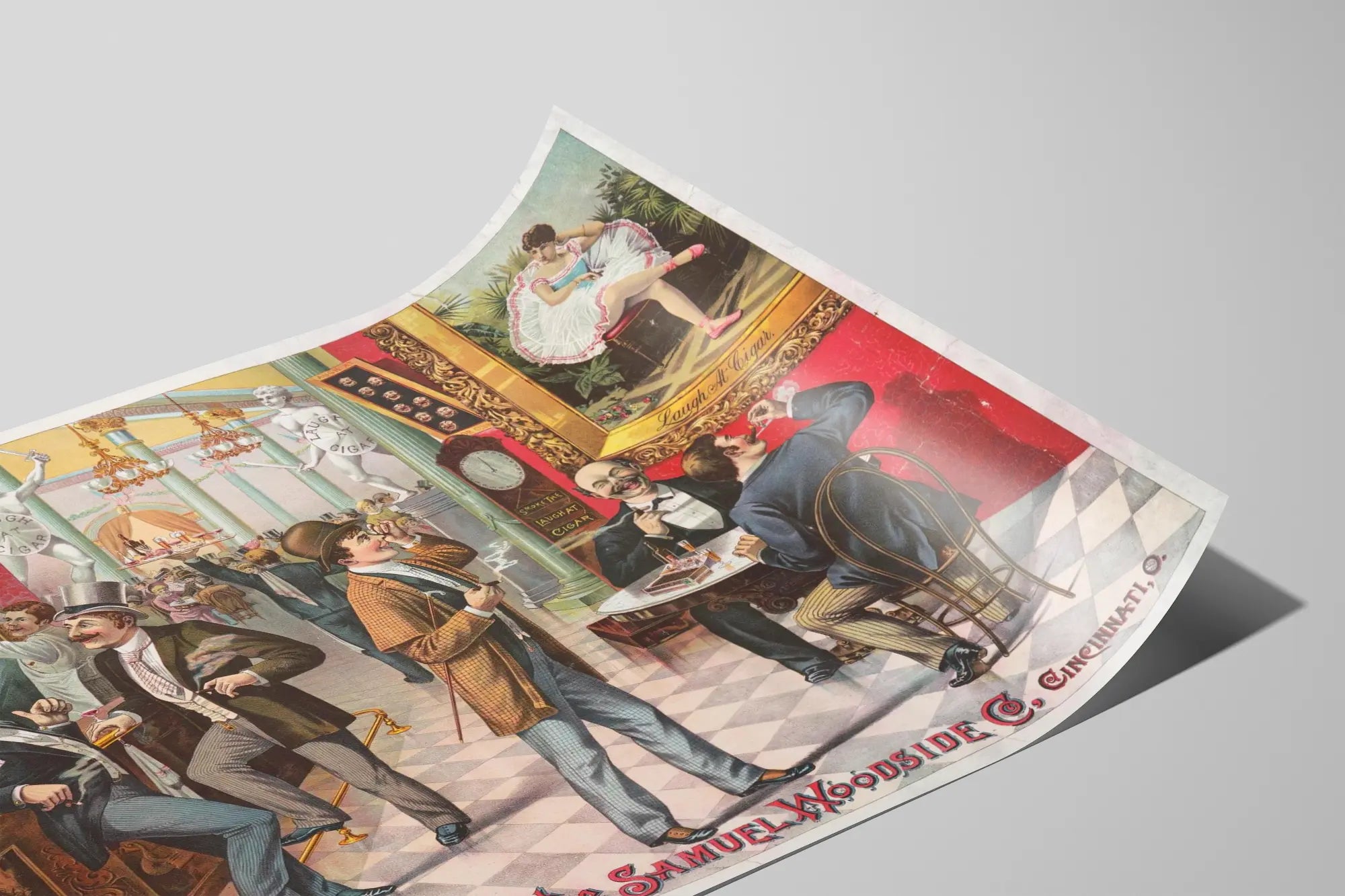 Upptäck denna färgstarka vintageaffisch med titeln "The Samuel Woodside Co., Cincinnati, O.", ett verkligt historiskt väggdekorationselement som tillför en retrocharm och en elegant atmosfär till ditt hem. Denna detaljerade illustration fångar en livlig scen inomhus på en elegant etablering, där män i tidsenliga kostymer röker cigarrer och umgås i en vänlig och förfinad stämning.