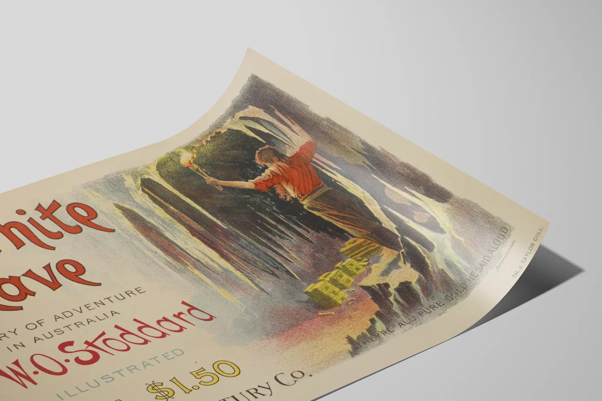 Den vintageaffisch med titeln "The White Cave" är ett unikt konstverk för alla som älskar väggdekoration med historia och äventyr. Den skildrar en suggestiv scen där en upptäcktsresande, som lyser upp en grotta med en fackla, hittar ett skatter av rent guld, vilket framhäver mysteriet och rikedomarna i ett australienskt äventyr. Denna gamla poster visar med varma färger och noggranna detaljer en fängslande atmosfär, perfekt för att tillföra äkthet och flykt till dina väggar.