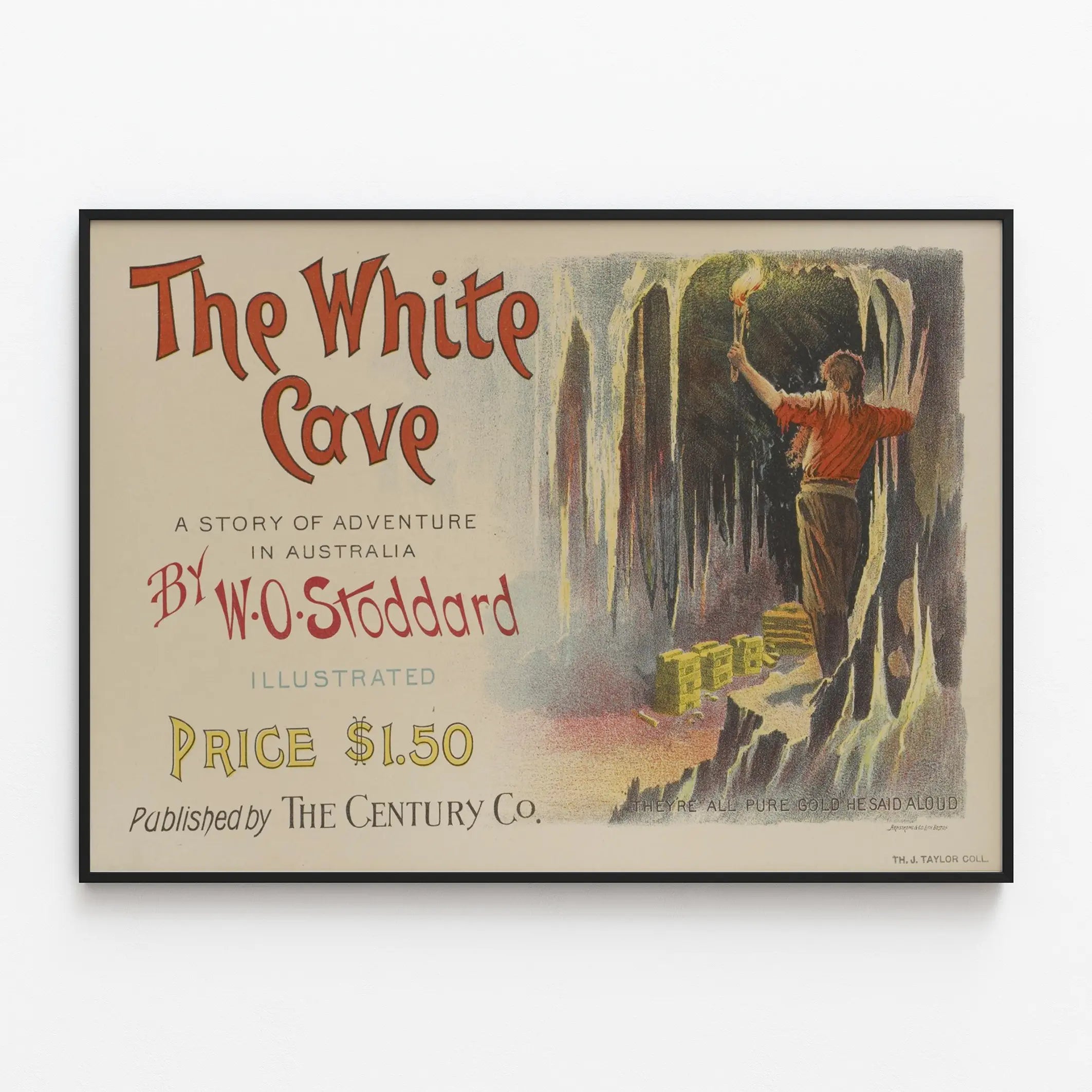 Utarbetad i en klassisk illustrativ stil, framhäver denna affisch en harmonisk balans mellan text och bild. Titeln i röda, imponerande bokstäver, "The White Cave", drar omedelbart till sig uppmärksamheten, medan notisen "A Story of Adventure in Australia" lovar en fascinerande berättelse. Hela kompositionen kompletteras av författarens namn W.O. Stoddard och en prisnotering, vilket ger en vintagekänsla och charm till denna poster.