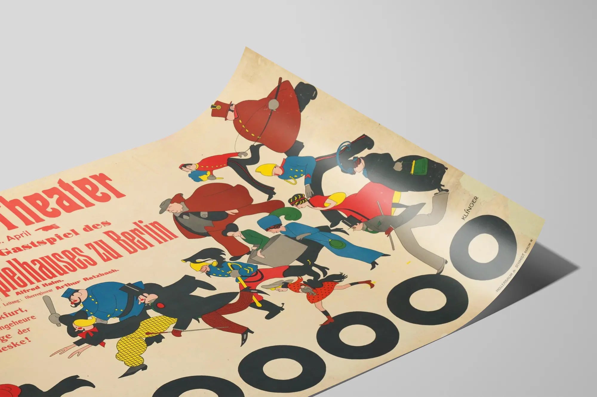Den här vintageaffischen för Walhalla-Teatern är ett originellt och fängslande konstverk för varje väggdekoration. Utformad i en retro och färgstark grafisk stil, skildrar denna affisch en livlig procession av animerade figurer, klädda i gammaldags mode och i full fart, vilket tillför energi och rörelse till bilden. De dominerande färgerna, inklusive klara röda och kontrasterande blå nyanser mot en beige bakgrund, ger ett starkt visuellt intryck som lyfter fram en gammal och konstnärlig charm på dina väggar.